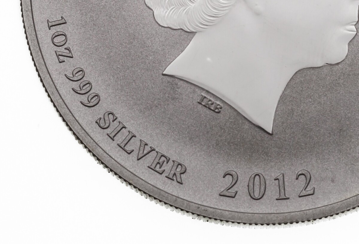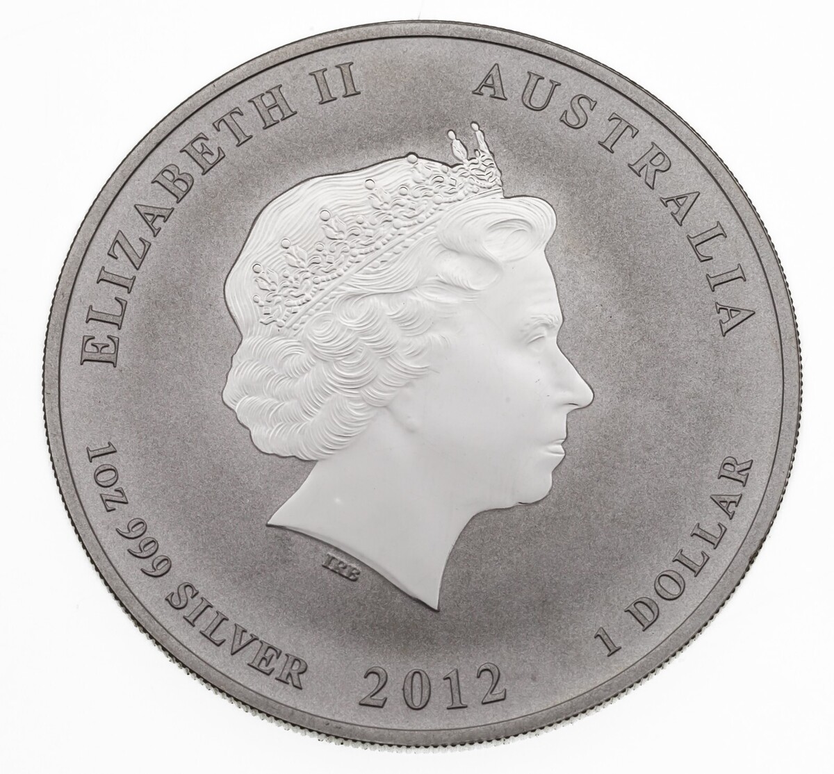 Reverse zeigt ein Profil von Queen Elizabeth II mit Inschrift "Elizabeth II / Australien / 1 Unzen 999 Silber / 2012 /1 Dollar".