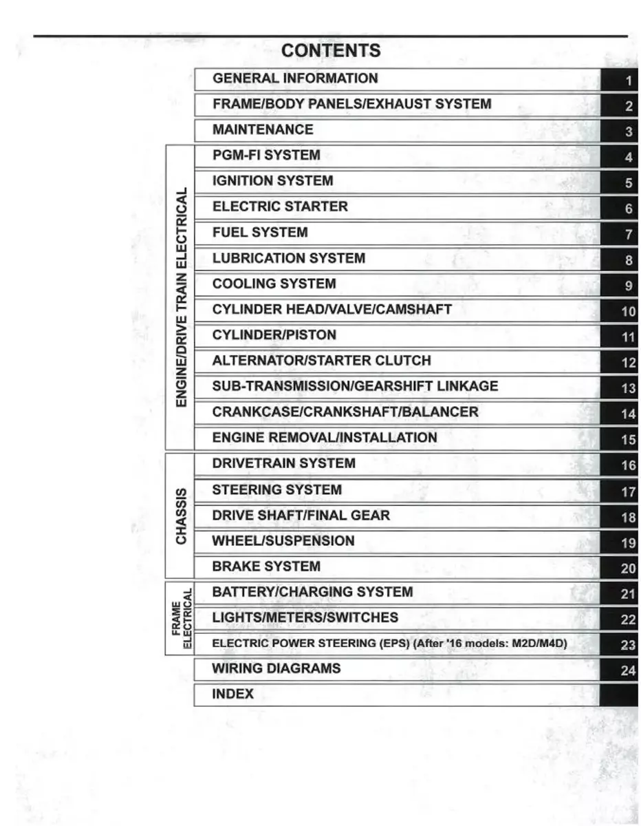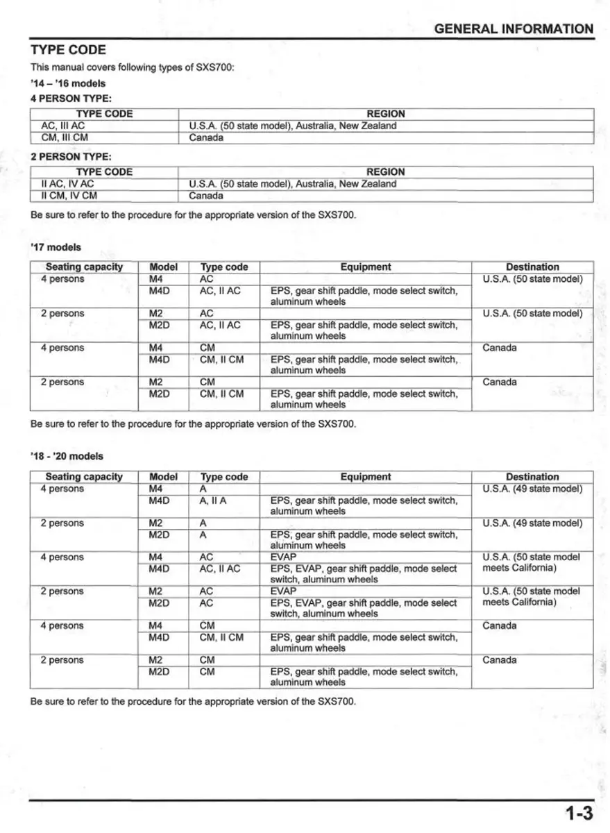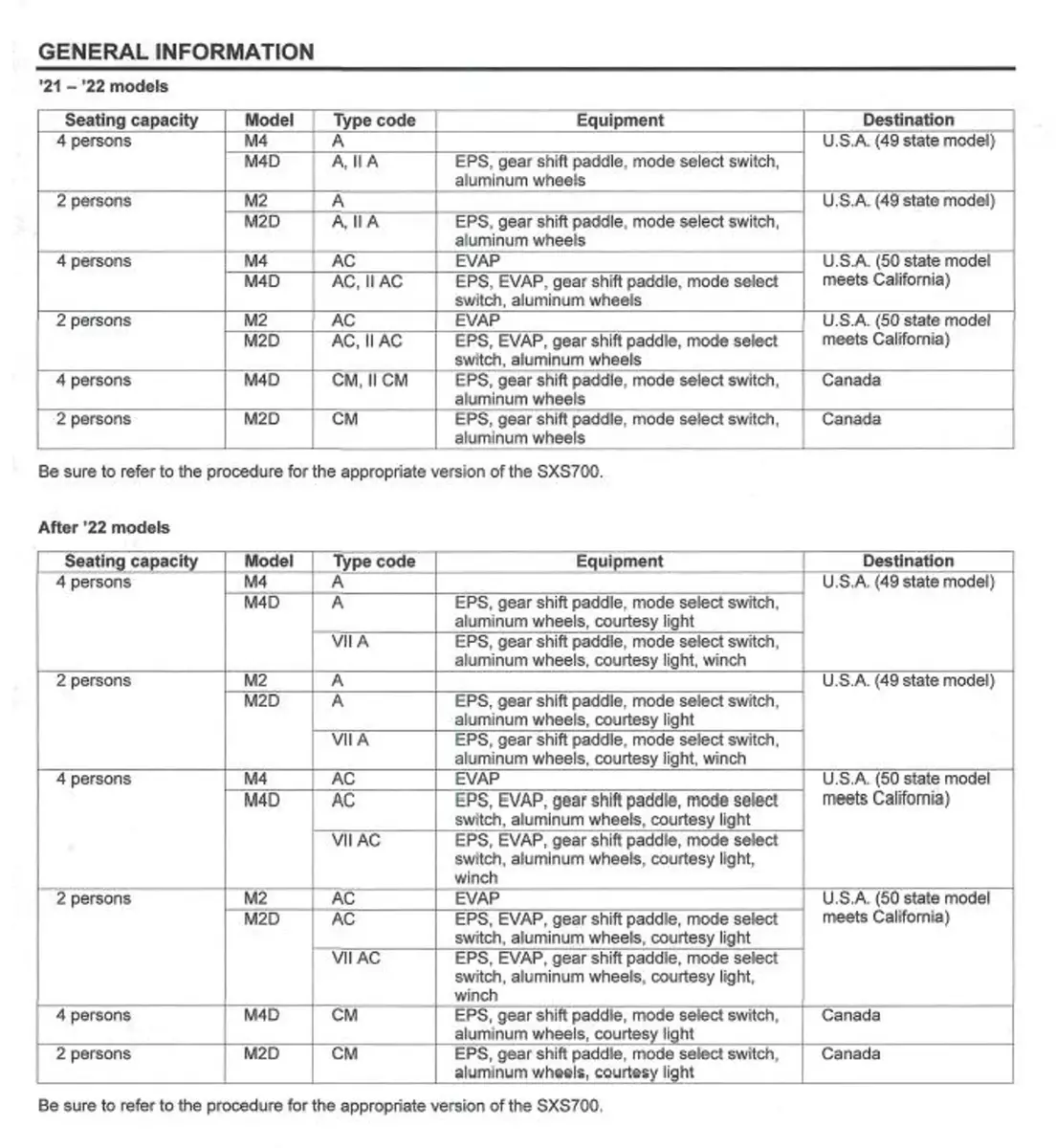 This manual includes model years 2014-2024 for the Honda Pioneer 700. This service manual is the most up to date version and includes many different trim packages and models of the Pioneer 700 (see images for models). This manual would be used by a technician at a shop.