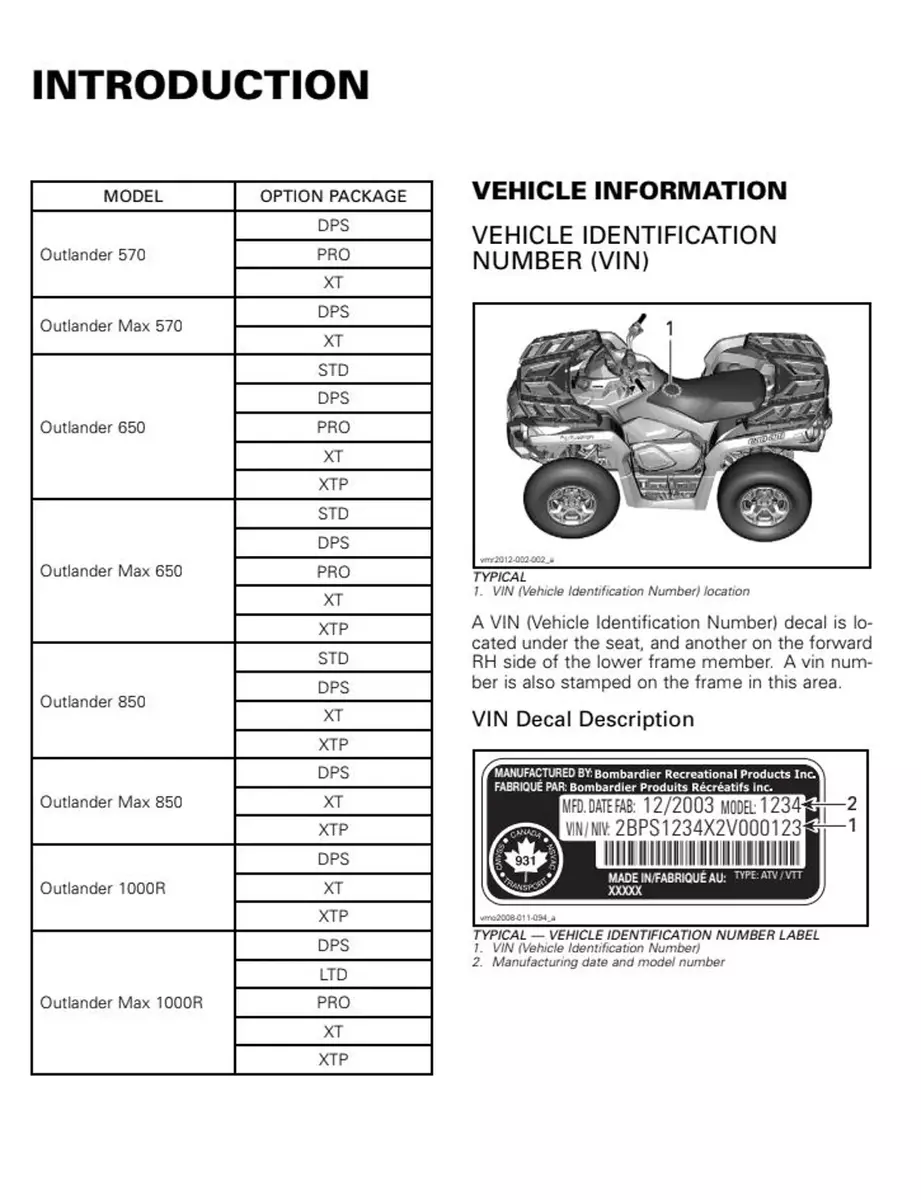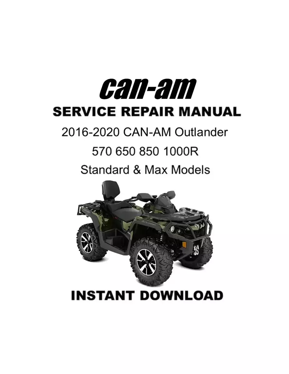 This manual includes model years 2016-2020 for the Can-Am Outlander 570, 650, 850 1000 Standard Models Max Models. This service manual is the most up to date version and includes many different trim packages and models of the Can-Am Outlander (see images for models). This manual would be used by a technician at a shop.