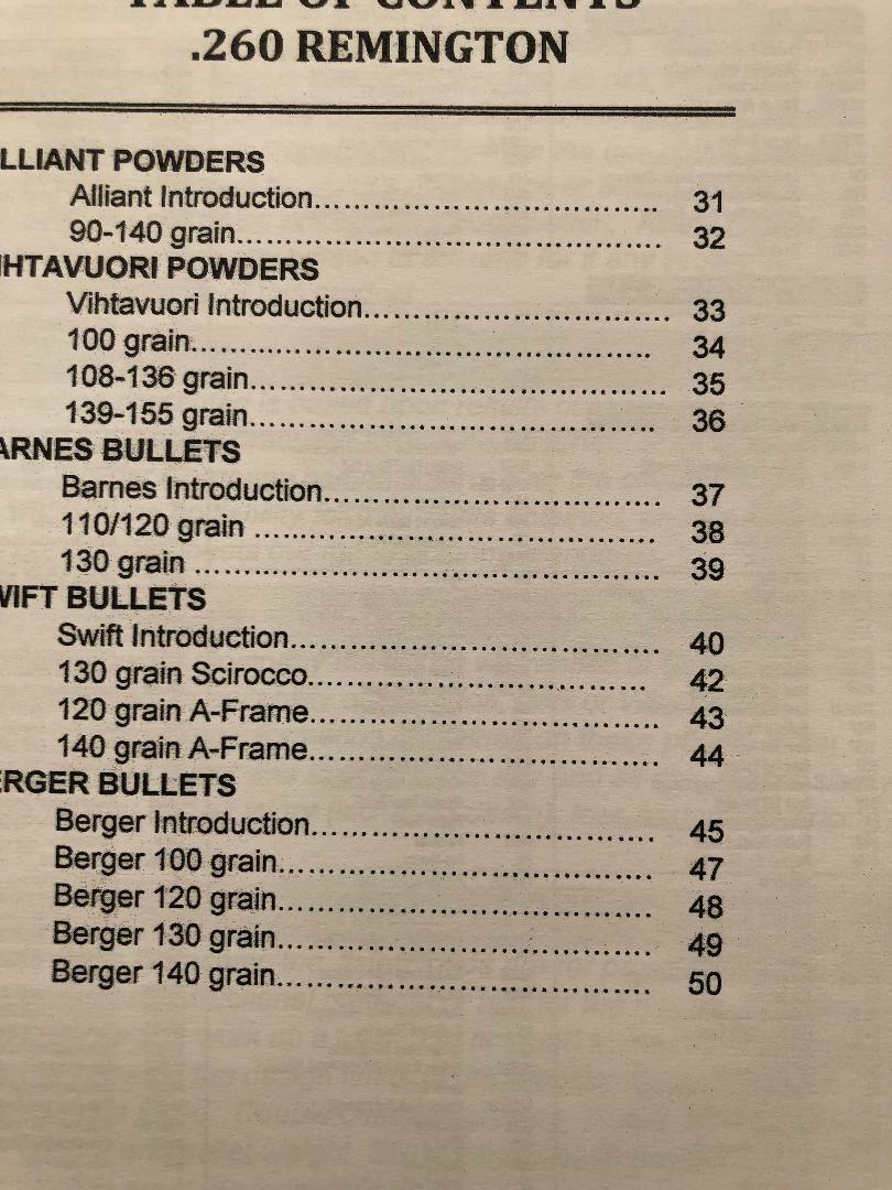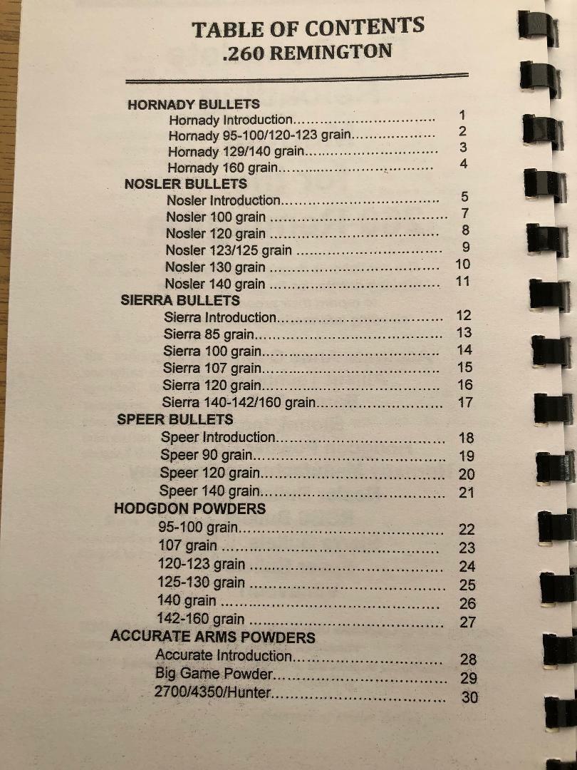 2016 The complete reloading manual for the .260 Remington, 54 pages, New latest edition. This manual contains 1304 Loads, 67 bullet designs, 52 different powders. Data in this manual is comprised from