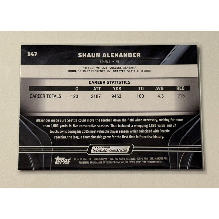 This 2023 Topps Composite sports trading card features Shaun Alexander, a former NFL player from the Seattle Seahawks. The card is made of aluminum and card stock material, with a thickness of 35 Pt. It is an original licensed reprint with a chrome finish, and is part of the 2023 Topps Composite set. The card number is 147 and it is a parallel variety. The card is in standard size and in English language. It is a great addition to any football fan's collection.