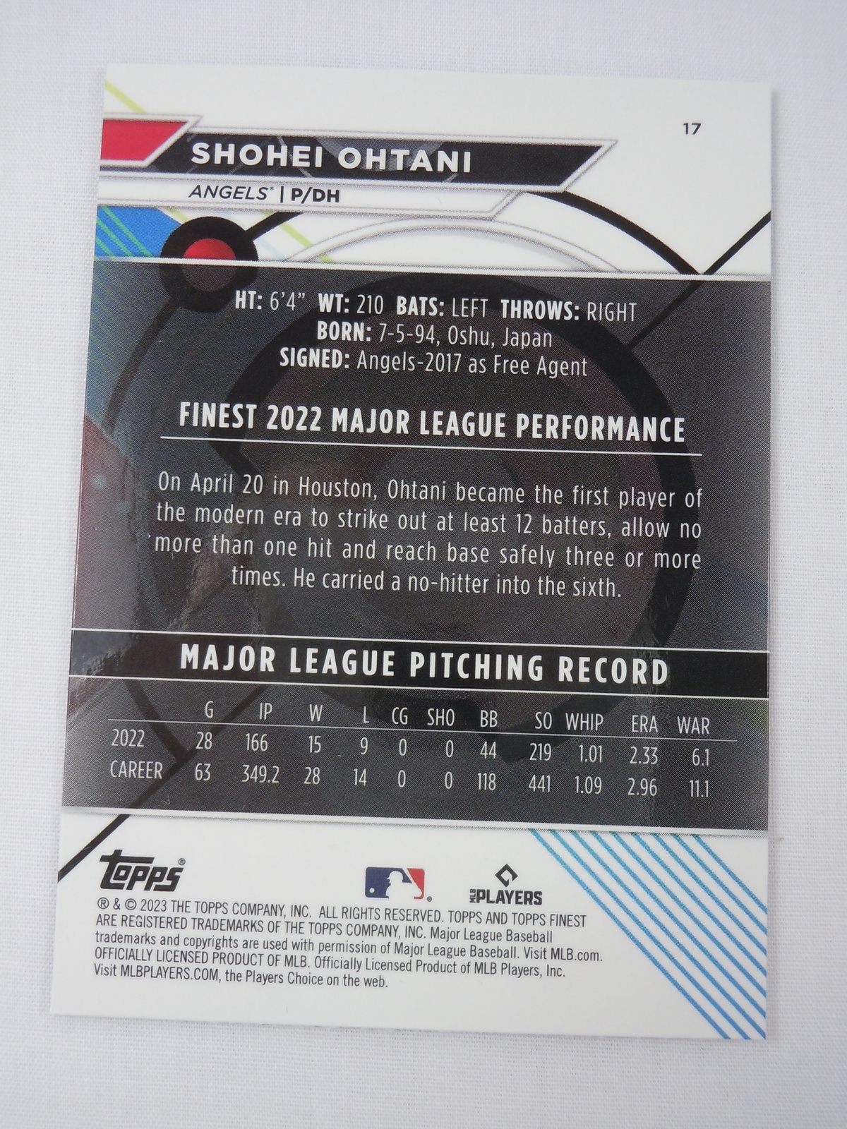 This is a nice example of a 2023 Finest #17 Shohei Ohtani .Other important information about this card: In 2023 Shohei Ohtani played for the Los Angeles Angels.Please check out our other listings for more great cards.