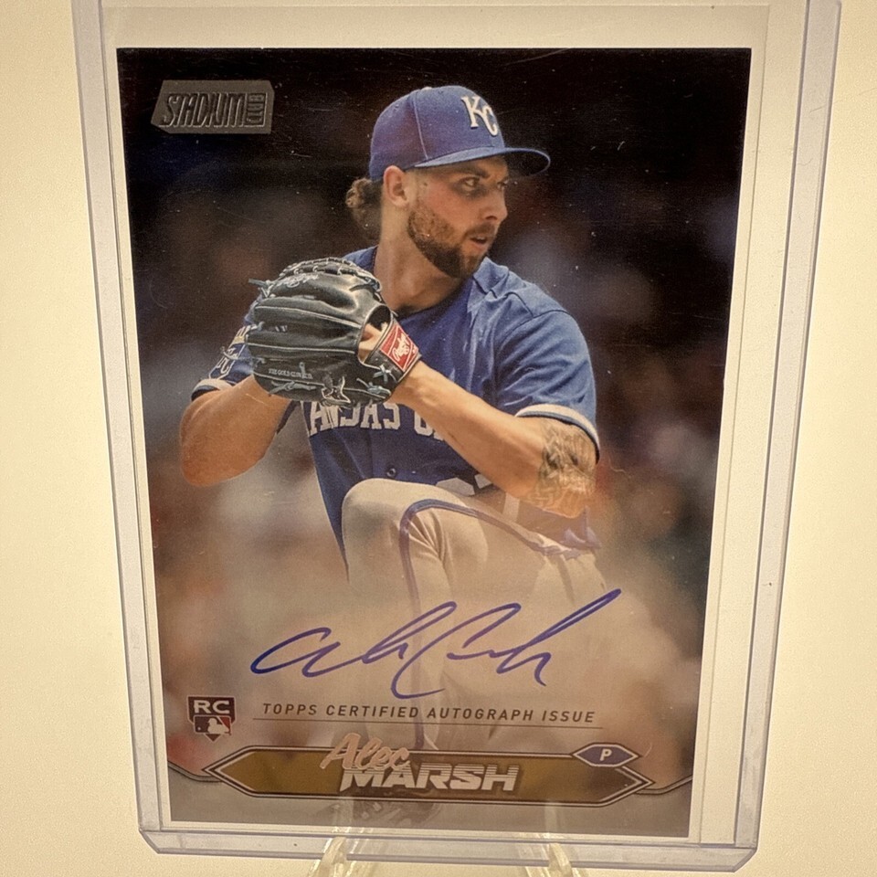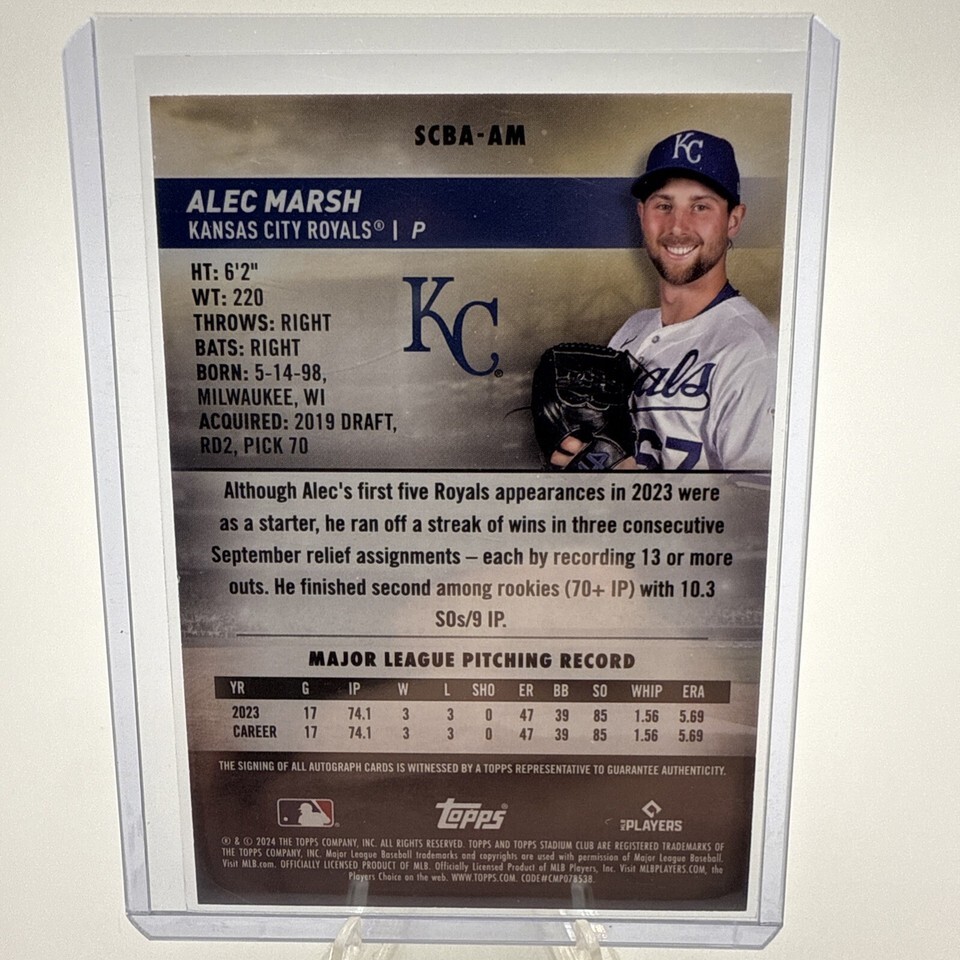 The product is a 2024 Stadium Club baseball trading card featuring rookie player Alex Marsh from the Kansas City Royals. It is autographed by Alex Marsh in a hard-signed format, authenticated by Topps. The card is part of the base set, signed on card, and designated with the card number SCBA-AM. It is manufactured by Topps and belongs to the Major League (MLB) series.