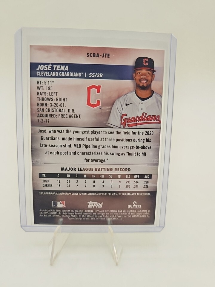 The product is a 2024 Topps Stadium Club Baseball trading card featuring rookie athlete Jose Tena. This card is an autographed and part of the SCBA-JTE set by manufacturer Topps. This sports trading card is a valuable collectible for fans and collectors of baseball memorabilia.