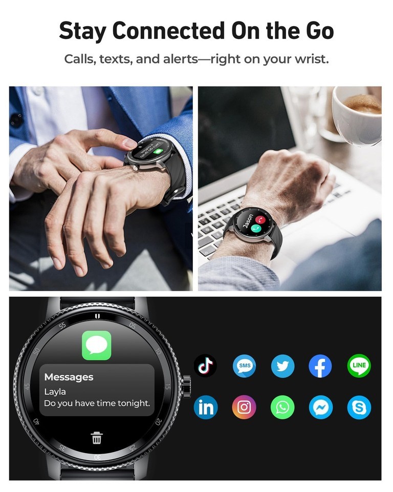 Make, answer, and hang up calls directly from your wrist using the built-in mic and speaker. Get real-time notifications for SMS, emails, Facebook, and other social apps ? no need to reach for your phone.