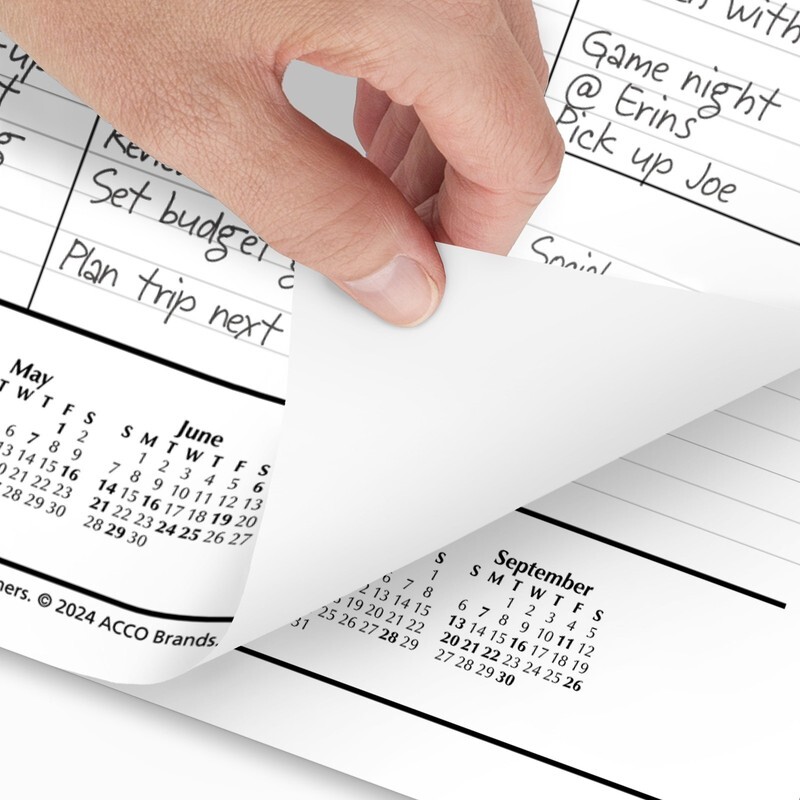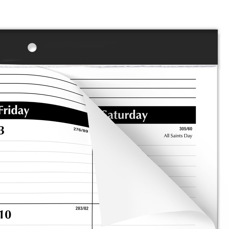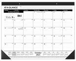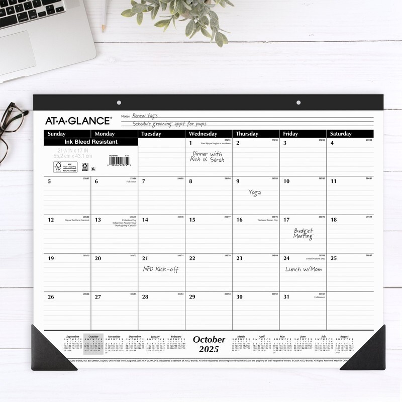 The AT-A-GLANCE 2026 monthly desk pad calendar with high quality paper features ink bleed resistance and covers 15 months from October 2025 ? December 2026 with Julian dates. The monthly pages have ruled daily blocks for neat planning. Pages measure 21 3/4" x 17" and daily blocks measure 3" x 2 3/8". The pages are perforated for easy tear out and have a full year reference calendar on the bottom of each page. Calendar headband has two eyelets for optional wall hanging.