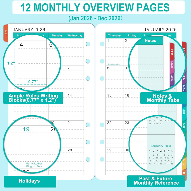 ?Refill Only ? This 2026 planner refills measures 4''x 6.73'', the size for use and carrying to school or office. And pre-drilled for 6-ring planners. Not include a binder, so you can choose your favorite binder and refill the plan into a 6-hole organizer.