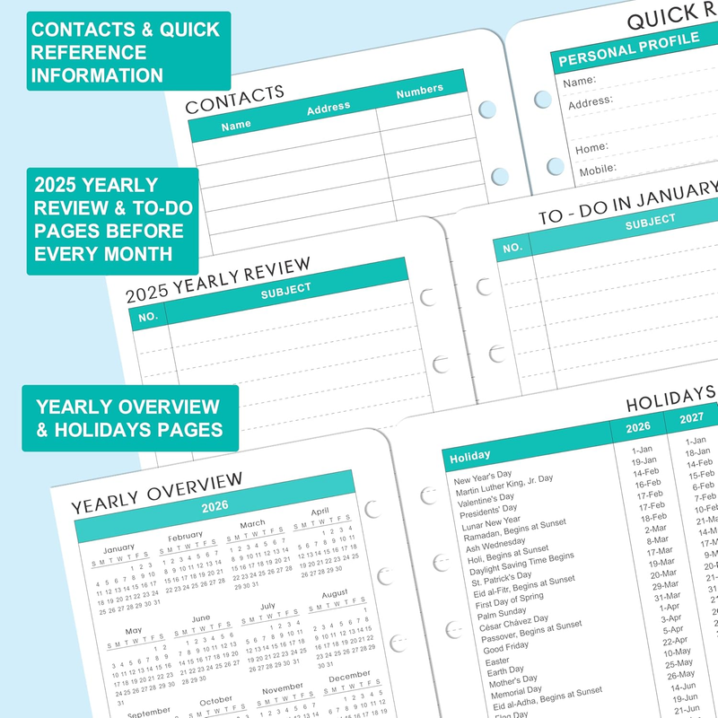 ?Functional Features ? A6 Size Weekly Monthly Pages | 2026-2027 Yearly Overview | 2026-2028 Holidays | To-do Pages | Contacts | Quick Reference | 7 Holes | Premium Paper | Monthly Tabs