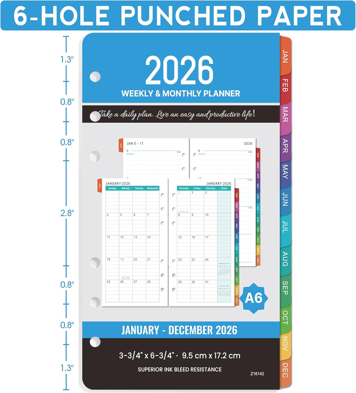 2026 Planner Refills - A6 Weekly and Monthly Planner Inserts, 4" X 6.73", Jan. 2026 - Dec. 2026, Planner Refills 2026, 6 Holes, Colorful Monthly Tabs