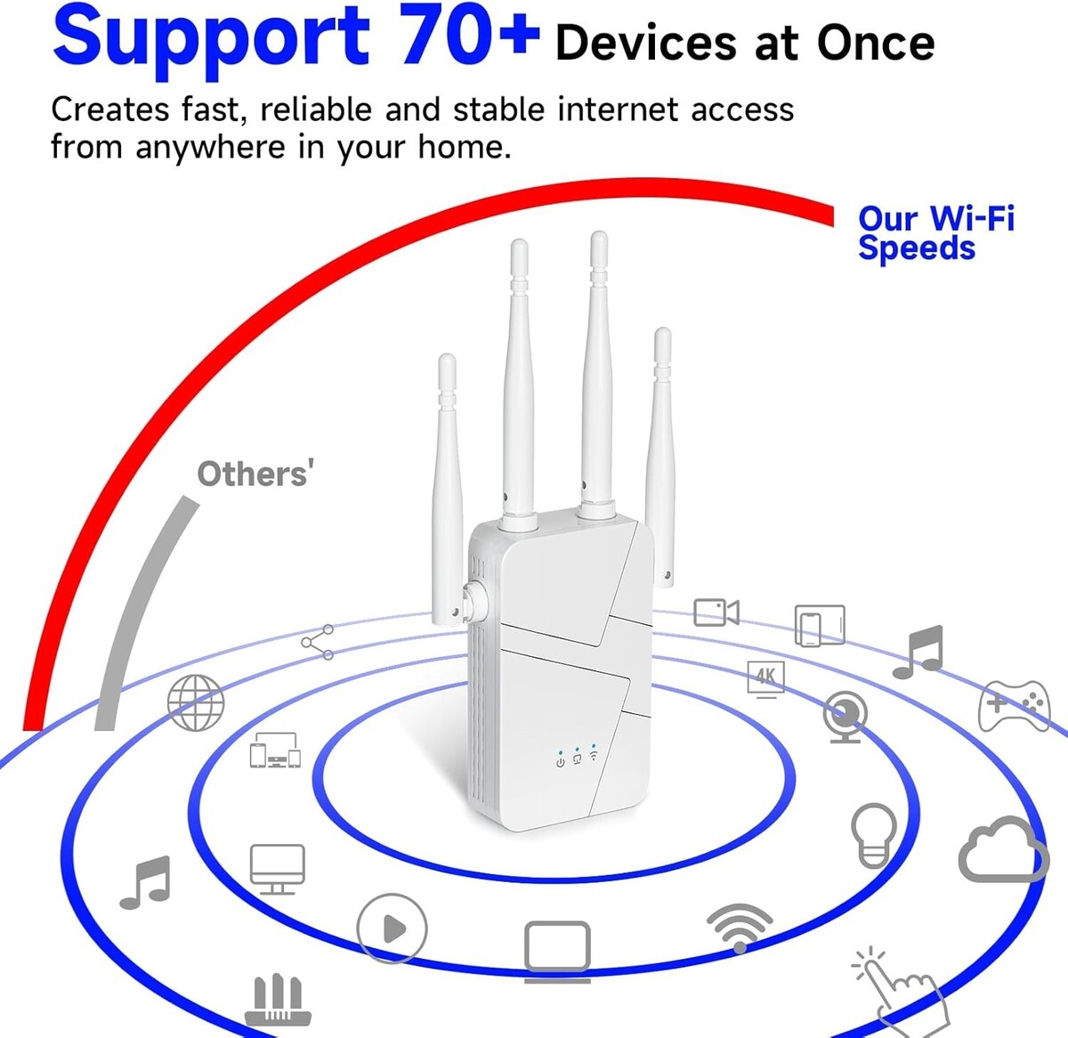 4 MODES MEET YOUR VARIOUS NEEDS: The internet booster support Repeater, Bridge, Access Point and Router 4 Modes. Whether you are working online, studying online or simply streaming, this 4-mode wifi repeater gets it done and can connect up to 70+ devices. Offering you strong and stable connection with devices such as laptops, smartphones, speakers, IP cameras, tablets, Fire Stick, and more