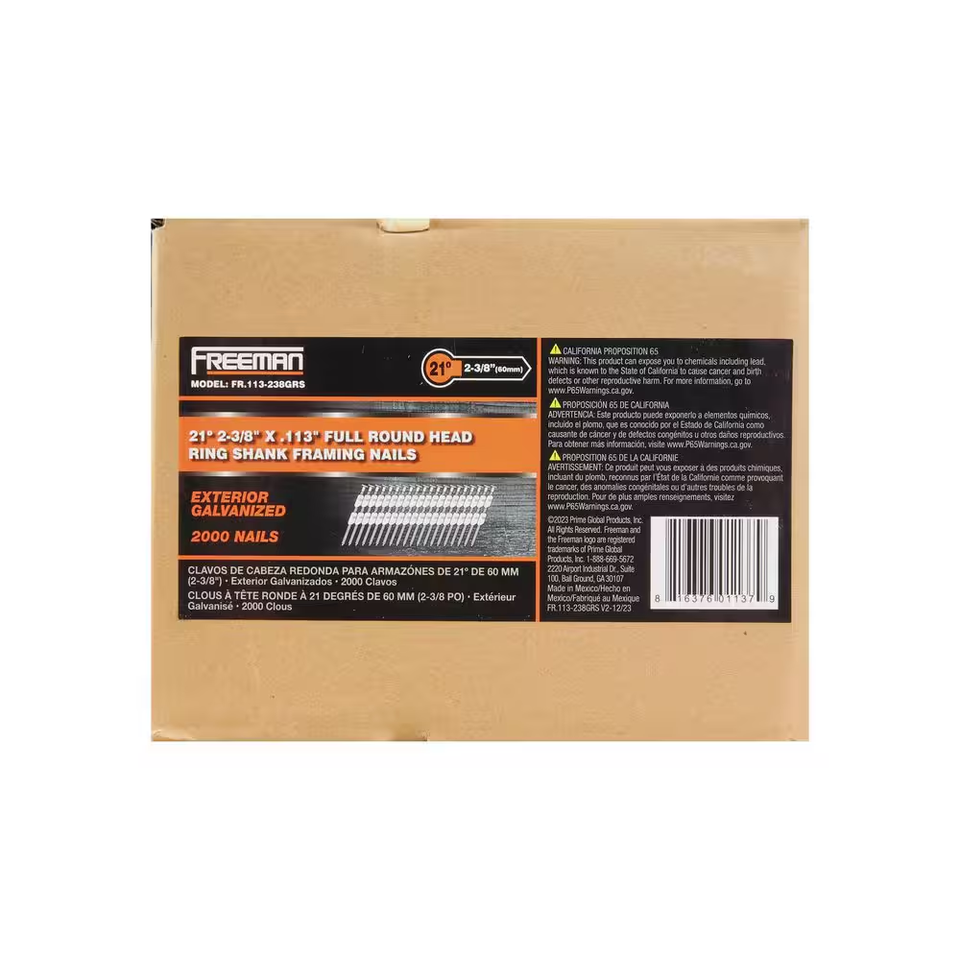 The Freeman 21 .113 in. x 2-3/8 in Plastic Collated Galvanized Ring Shank Full Round Head Framing Nails are engineered for durability and strength in demanding construction applications. Made from galvanized steel, these nails resist corrosion and rust, making them suitable for both indoor and outdoor projects. Perfect for framing, subfloors, roof decking, pallet and shipping crate assembly, and wood fencing, the ring shank design provides maximum withdrawal resistance and holding power. Each contractor-size box includes 2,000 galvanized framing nails, reducing reloads while boosting productivity. The 21 plastic collated strips deliver smooth feeding and jam-free firing for consistent jobsite performance.