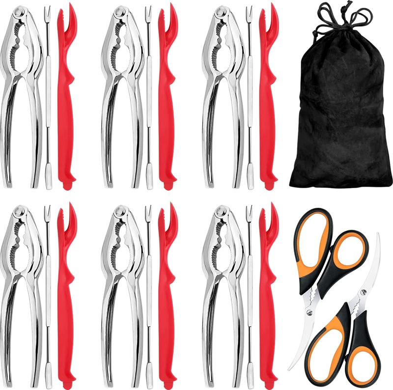 Professional Seafood Tools Set includes 6 zinc alloy crab crackers, 6 Food-Grade plastic lobster shellers, 6 stainless steel crab leg forks/picks, 1 stainless steel seafood scissors and 1 cotton storage case. Our versatile set is a must-have in any kitchen, restaurant or parties and makes a fantastic gift to anyone with taste for seafood Heavy Duty and Durable: Solid die-cast zinc alloy crackers with jagged teeth and durable hinges to take significant pressure; High-grade double ended stainless steel forks; Stainless steel shellfish scissors are sharp to cut through tough, shell of crab and lobster legs and are delicate enough to open up small lobster or shrimp; Food-grade and lightweight plastic shellers will crack and peel all legs and claws Safe: Anti-slip grooved inner sides of crab crackers prevent slipping and will grab the object with secure but safe grip; Ergonomic design of the handle secures safe grip; Our set is rustproof and dishwasher safe to last for years to come; Provided cotton pouch will hold all elements together for safekeeping and without worries of misplacing any