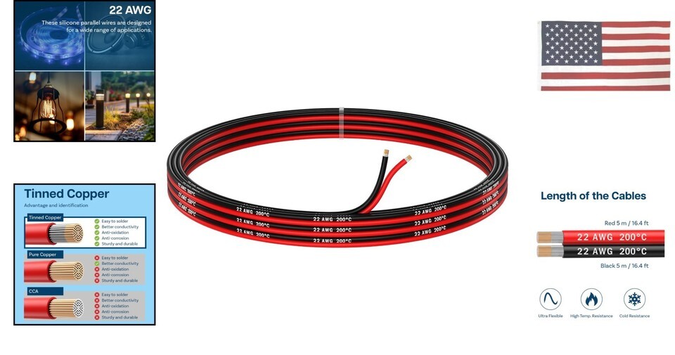 - 22 AWG Silicone Electrical Wire 2-Conductor Parallel Cable, Tinned Copper, Re...