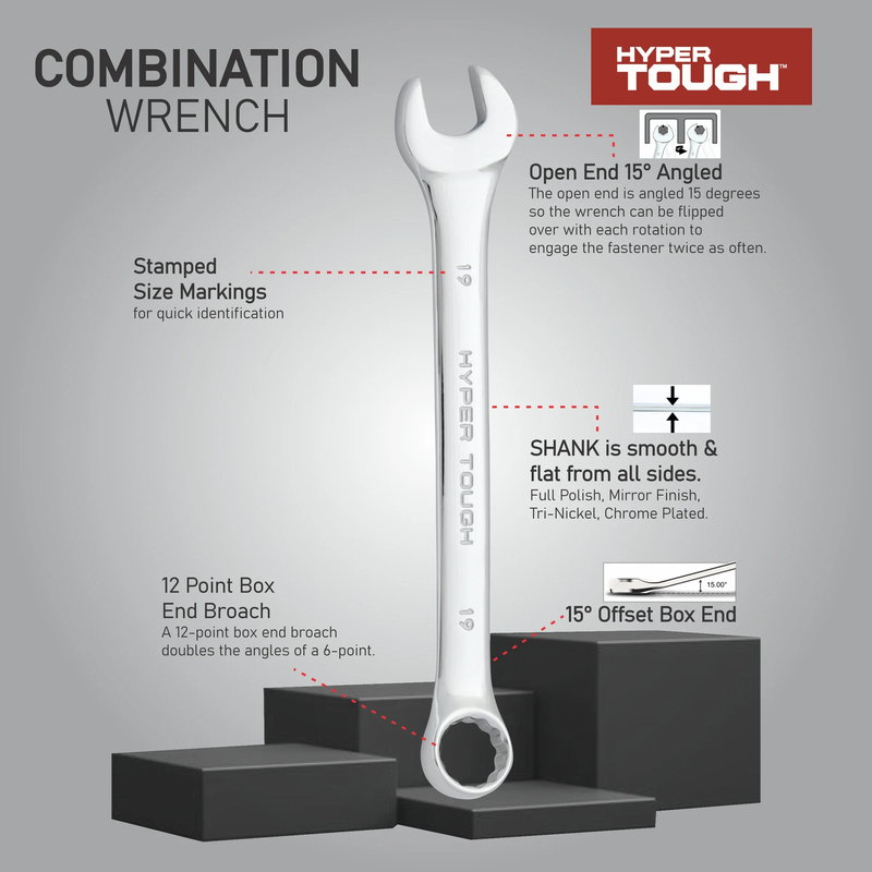 Hyper Tough 22 Piece Combination Wrench Set, Metric and SAE Chrome Vanadium Steel Mirror Polished Heat Treated Precision Machined Nickel Chrome Plated Sizes: 5, 6, 7, 8, 9, 10, 11, 12, 13, 14, 15 MM 1/4, 9/32, 5/16, 11/32, 3/8, 7/16, 15/32, 1/2, 9/16, 19/32, 5/8 Meets ASME standards