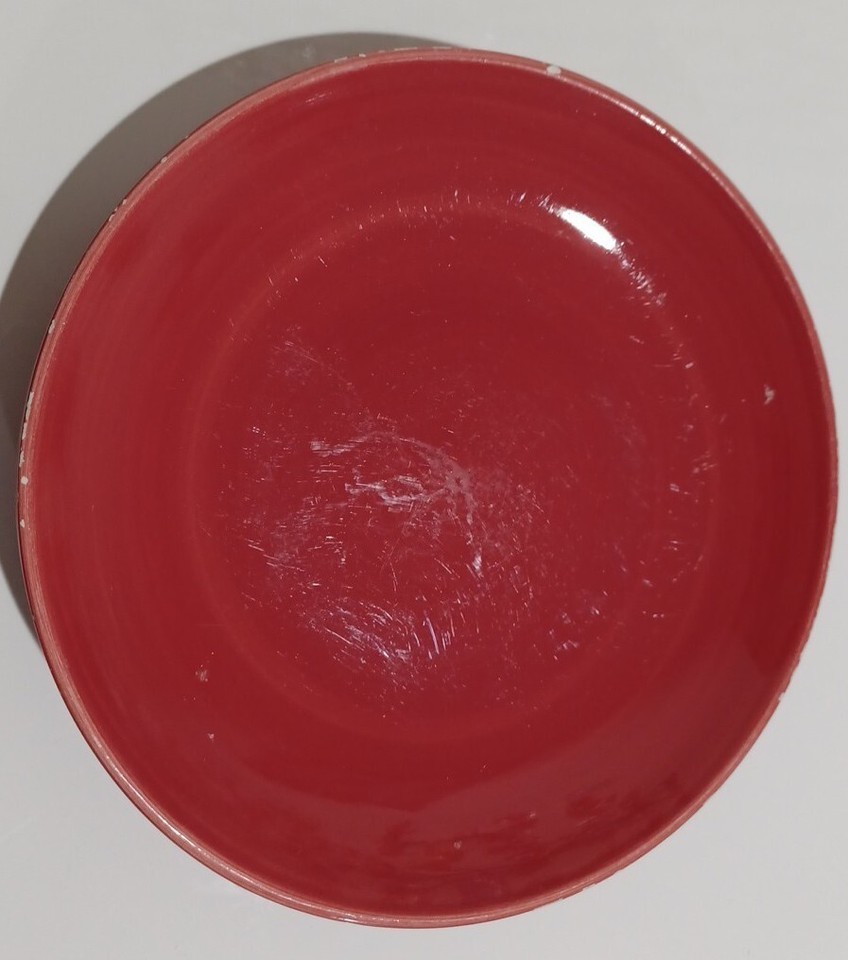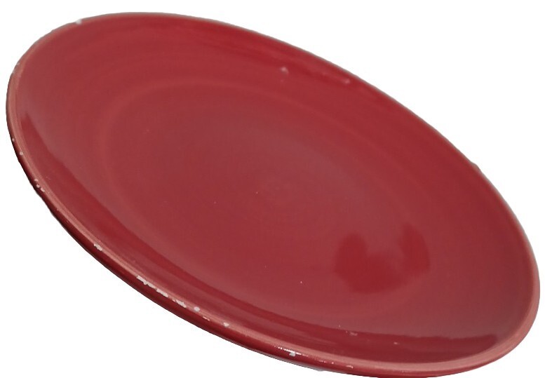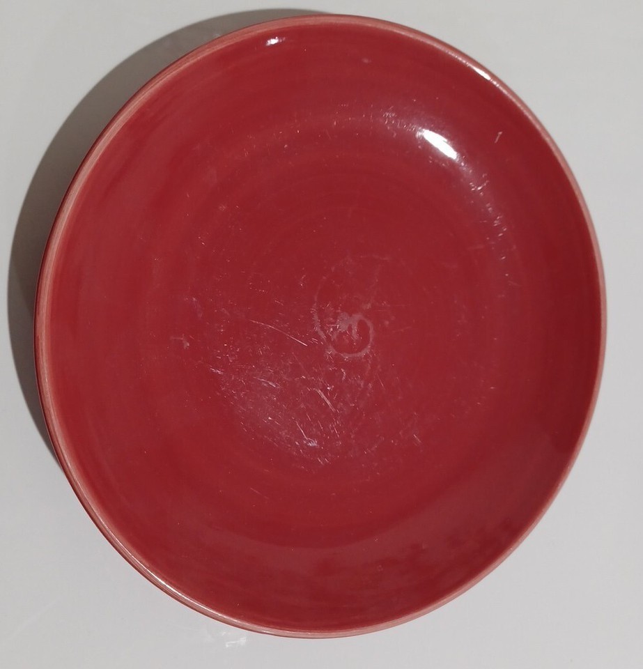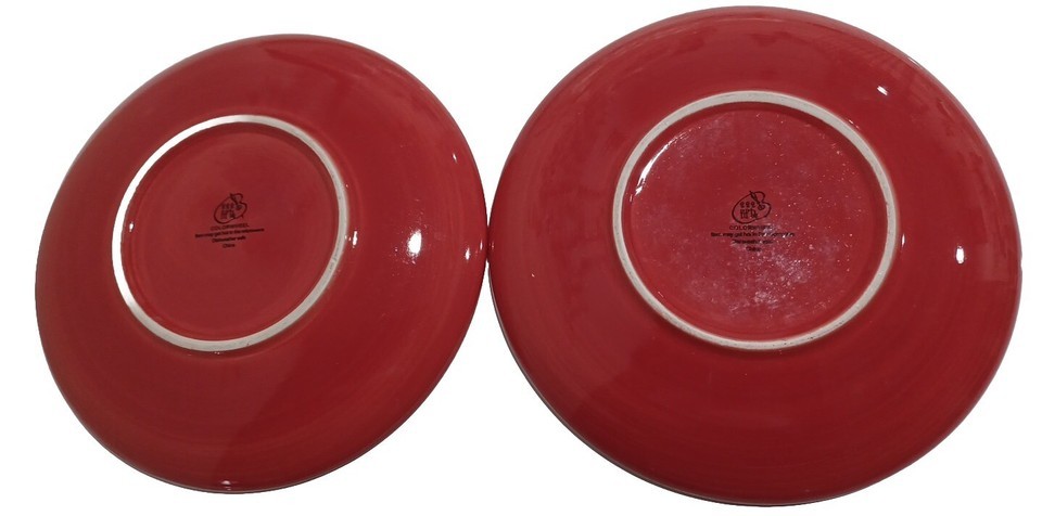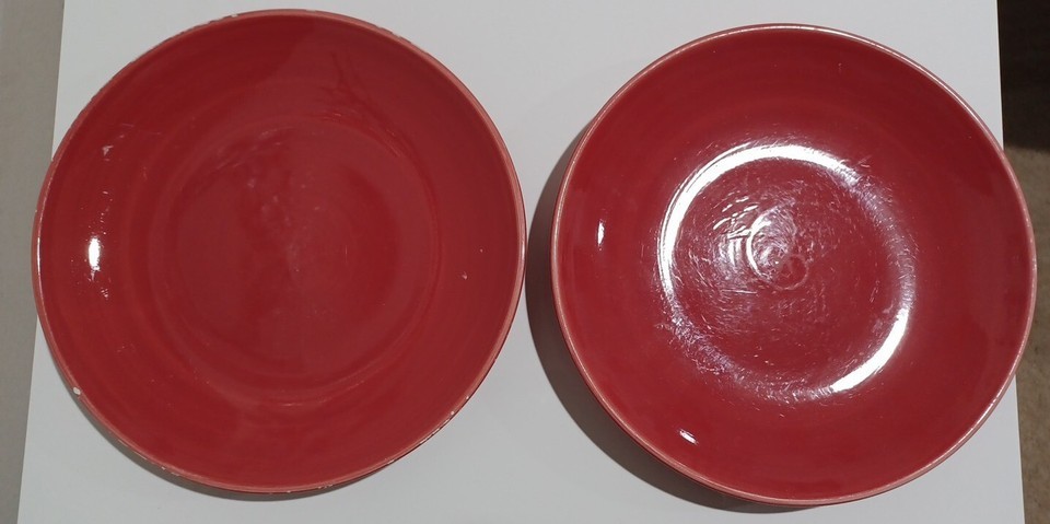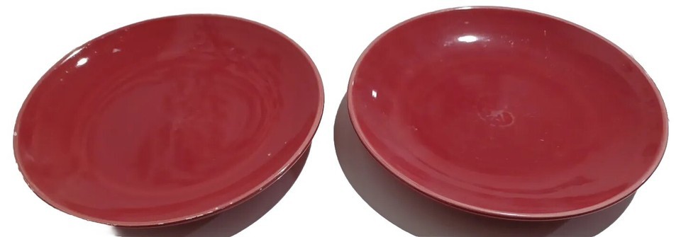 This is a listing for a set of 2 pre-owned, heavily used red Colorwheel 8" plates. The plates were used daily at one time and there are scratches, discolorations and scuffs, all as pictured. There are small chips on the edge of 1 plate.