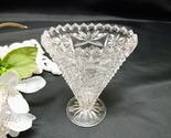 Up for your consideration is a very pretty little miniature fan vase called Stars N Bars made in 1995. It was made by Anchor Hocking glass which sports a sawtooth rim around the top of the vase and has a floral design in the glass. What a beautiful piece to display in your home or give as a cherished gift. You can also show off a tiny little silk floral arrangement with this piece. What a precious piece to have from the past.