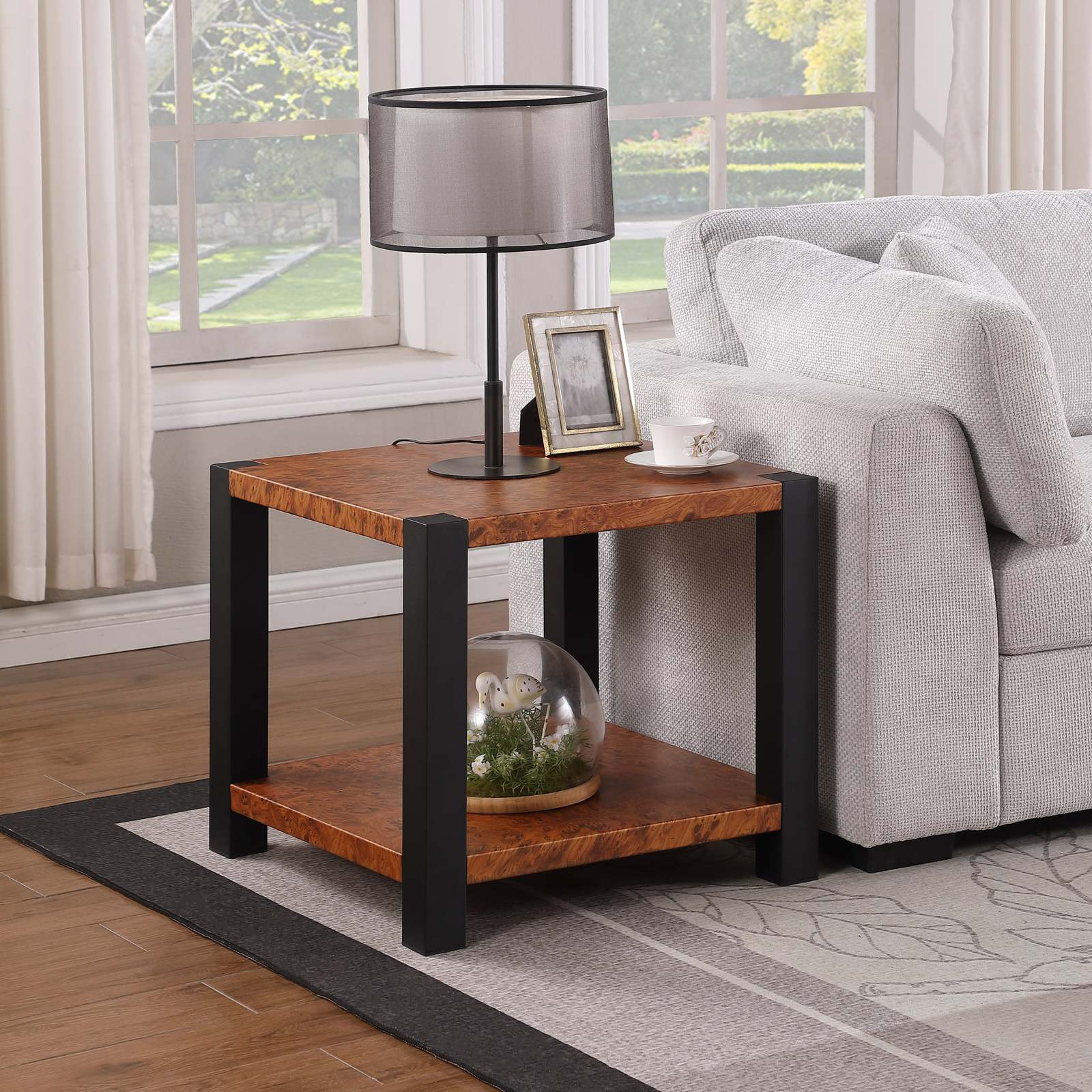 23.6" Square Burl Wood Metal Top Matte Black Double Layer End Table