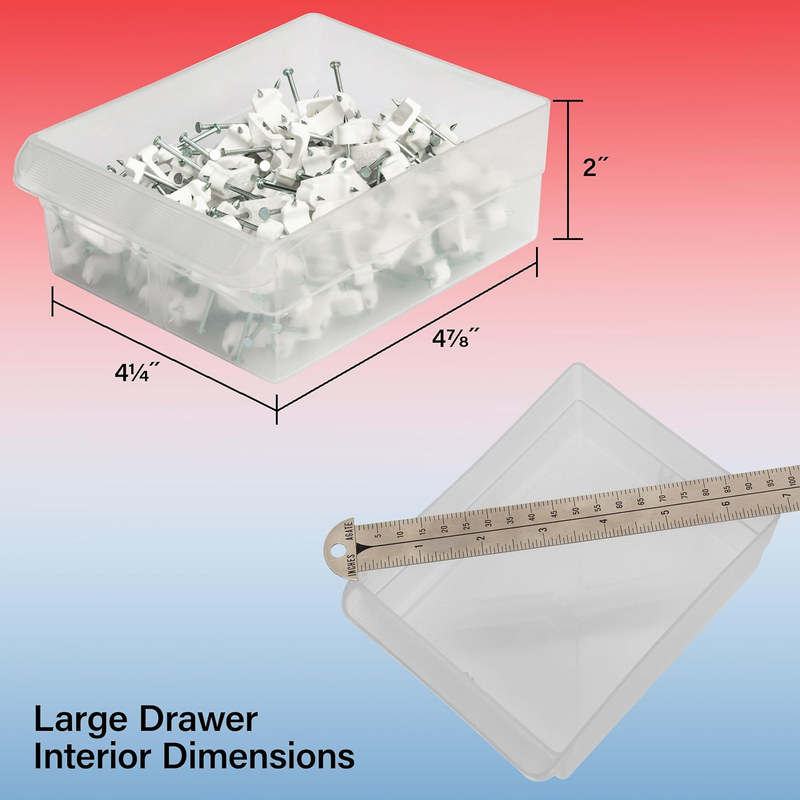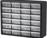 The Akro-Mils 10724 24-Drawer Plastic Storage Cabinet Organizer with Drawers is a great solution for all your storage needs. This heavy-duty cabinet is made in the U.S.A. from rugged, high-impact polystyrene plastic and features 24 large and small plastic drawers offering ample storage space for all your small parts and tools. Plastic organizer drawers inside dimensions: 4-7/8-Inch x 4-1/4-Inch x 2-Inch. Whether you're looking to organize your garage, workshop, classroom, or home, this storage cabinet has you covered. Garage owners and businesses will love the versatility of this cabinet, with the plastic storage drawers perfect for use as a hardware organizer, screw organizer box, or for battery storage. Keep your nails and other small parts accessible with ease. Teachers can use the cabinet for classroom storage, as a teacher toolbox, art storage, craft storage box, for scrapbook supplies, and more. This plastic storage cabinet is also perfect for home storage and organization. Use it as a lego organizer, craft organizer, hobby organizer, or bead storage organizer. It's even great for makeup storage and organization or for medicine and first aid supplies. And with the ability to stack cabinets securely or wall-mount them using keyhole slots, along with finger-grip drawer pulls and rear stop tabs to prevent contents from spilling, this cabinet has everything you need to keep your items safe and organized. Cabinets have 8 small crosswise dividers and 4 large length dividers included. Included dividers are molded into the back of the cabinet (remove with scissors). Additional dividers can be purchased separately.
