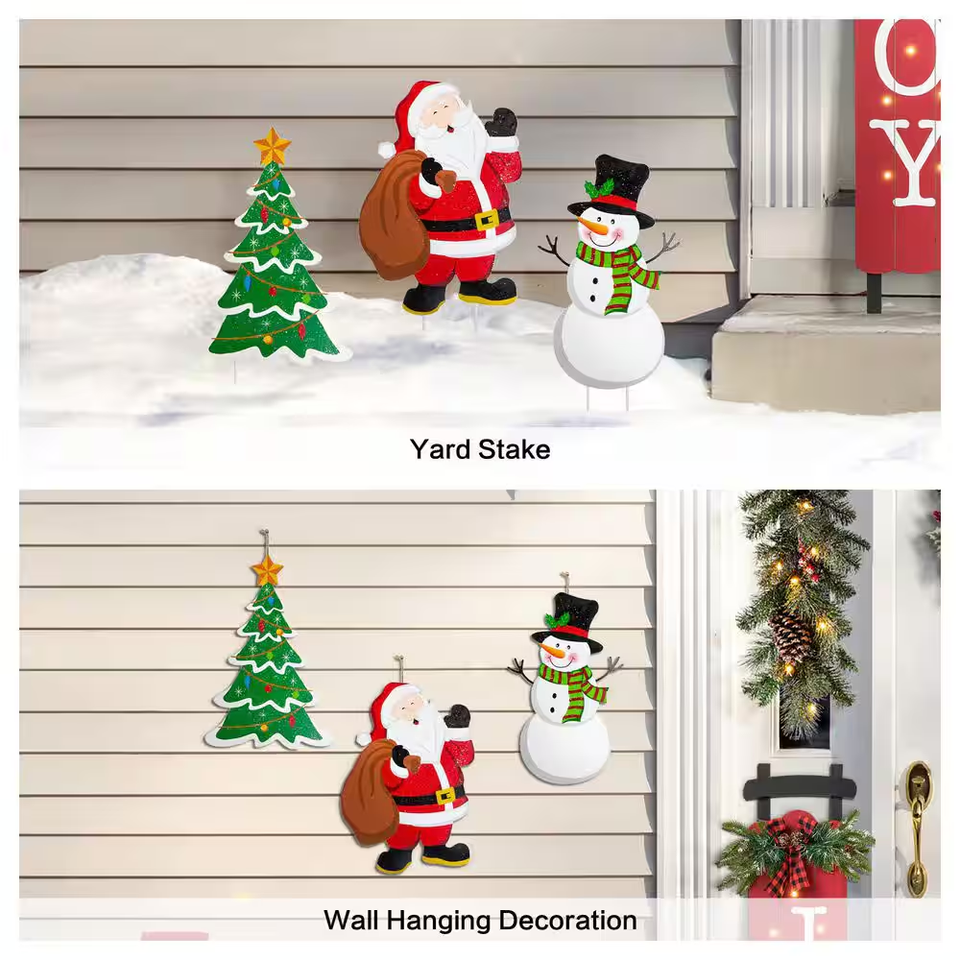 - 24 In. H Set of 3 Metal Santa/Snowman/Tree Yard Stake or Wall Decor ( KD, 2 Func