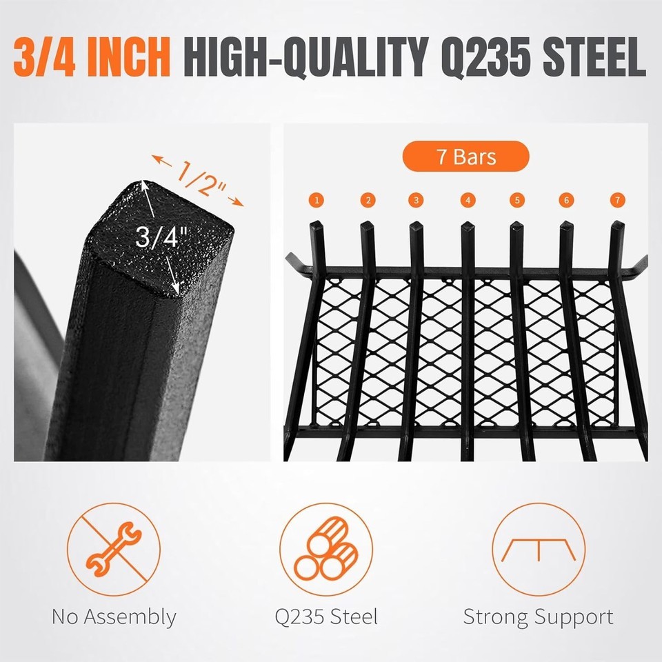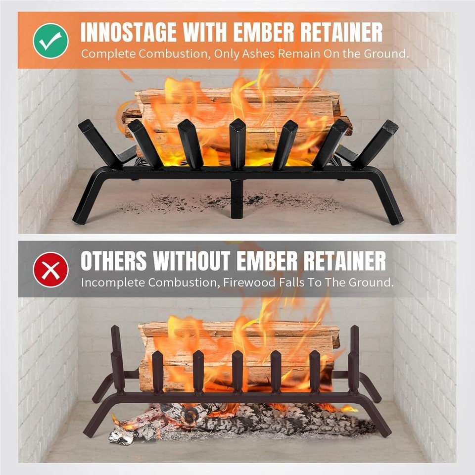 Heavy-Duty Steel Construction: This fireplace grate 24 inch is crafted from durable Q235 steel for long-lasting use. Featuring four stability legs, it prevents wobbling from heat and heavy firewood. The wide bars and ember retainer provide a larger surface area, making it easy to stack and hold logs securely
