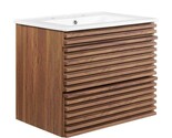 - 24” Mid-Century Wall-Mount Bathroom Vanity Walnut Laminate White Sink