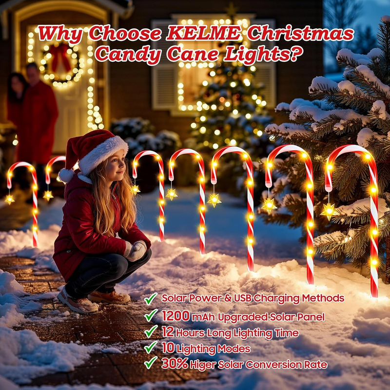 ?Solar Charging USB Charging?Upgraded candy cane lights with high-efficiency solar panel and built-in 1200mAh rechargeable battery. These Christmas solar lights outdoor provide up to 12 hrs of lighting after a full 6-8 hr solar charge. For convenience, the outdoor solar Christmas lights also support USB charging indoors. On cloudy, rainy, or snowy days, simply remove the solar panel stake and recharge indoors in 1?2 hours, ensuring your outdoor Christmas decorations stay bright all night long.