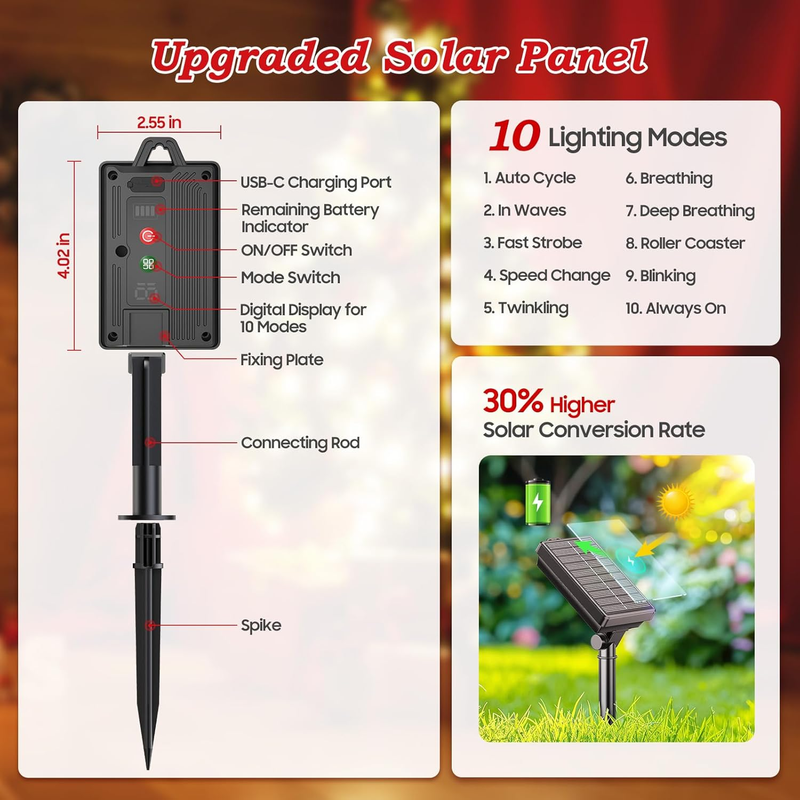?10 Lighting Modes?This waterproof solar Christmas lights outdoor set offers 10 different lighting modes, allowing you to create a variety of holiday atmospheres?from joyful and lively to warm and cozy. Modes include steady-on, slow fade, flashing, and more. Switching between modes and turning the lights on or off is easy with the control switch located on the back of the solar panel, giving you full control over your Christmas outdoor decorations.