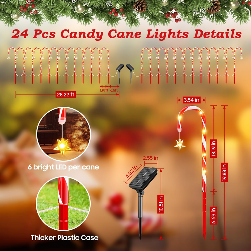 ?Upgraded 24-Pack Christmas Candy Cane Lights?This solar Christmas lights outdoor set includes 2 sets of 12 pack candy cane lights. Each light is equipped with 6 bright LED bulbs. Connected by durable copper wire with a total length of 28 ft(8.56m), these solar Christmas lights are easy to arrange and decorate as you like. With IP65 waterproof protection, solar powered Christmas lights shine steadily even in rainy or snowy weather. A perfect choice for outdoor Christmas decorations.