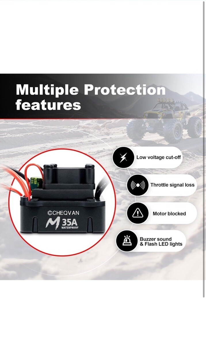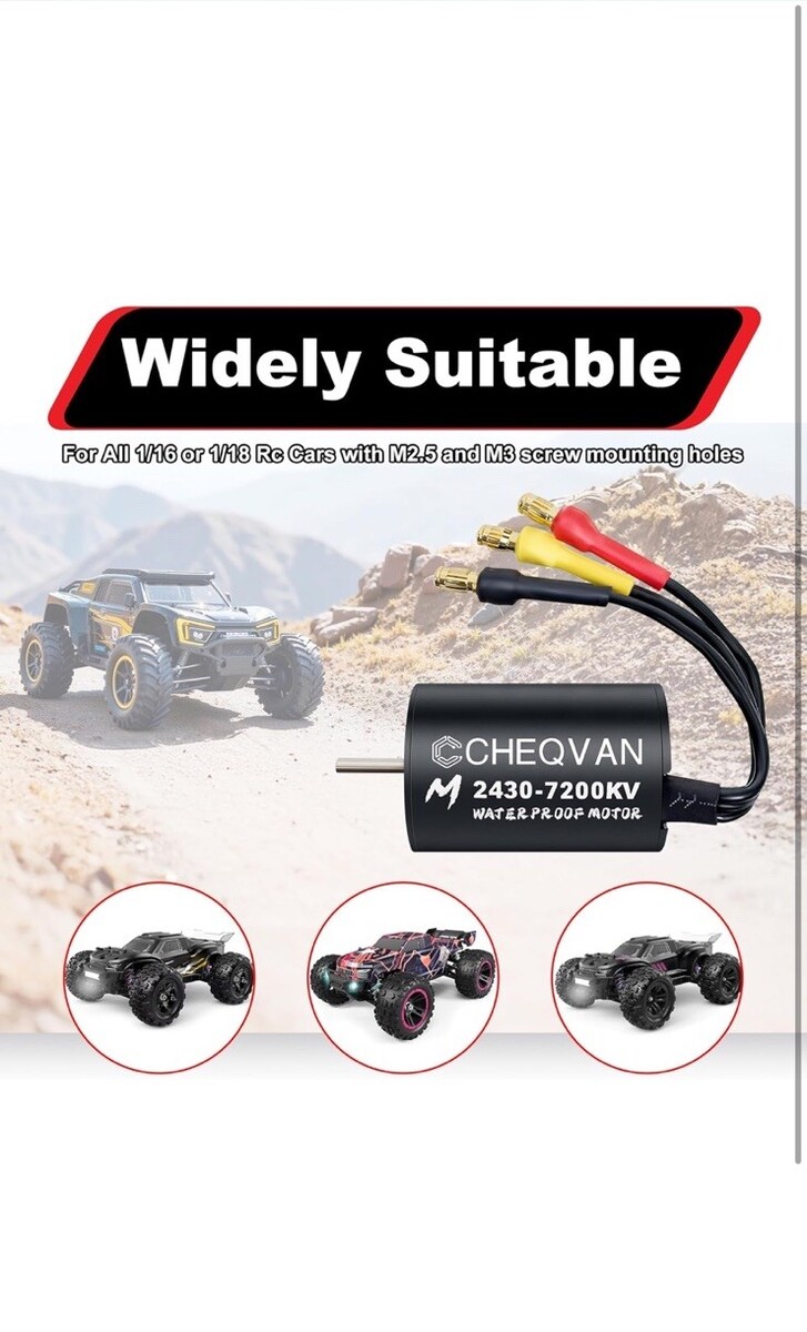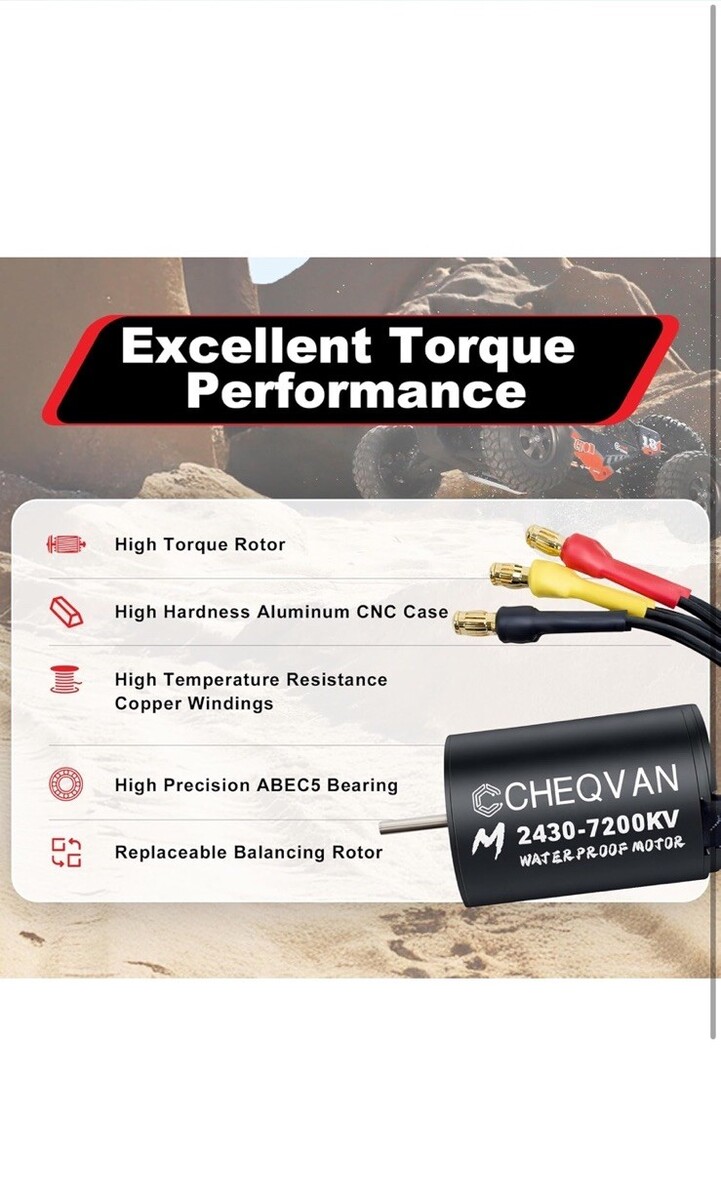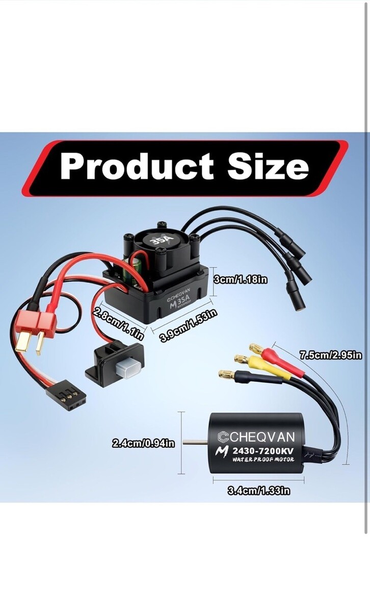 The product is a CCHEQVAN 2430 7200KV brushless motor with a 35A ESC combo. This motor is designed for RC model vehicles and is known for its high performance and efficiency. The 35A ESC provides reliable electronic speed control for the motor, allowing for precise and responsive operation. This combo is a great choice for hobbyists looking to upgrade their vehicles with a powerful and durable electric motor.