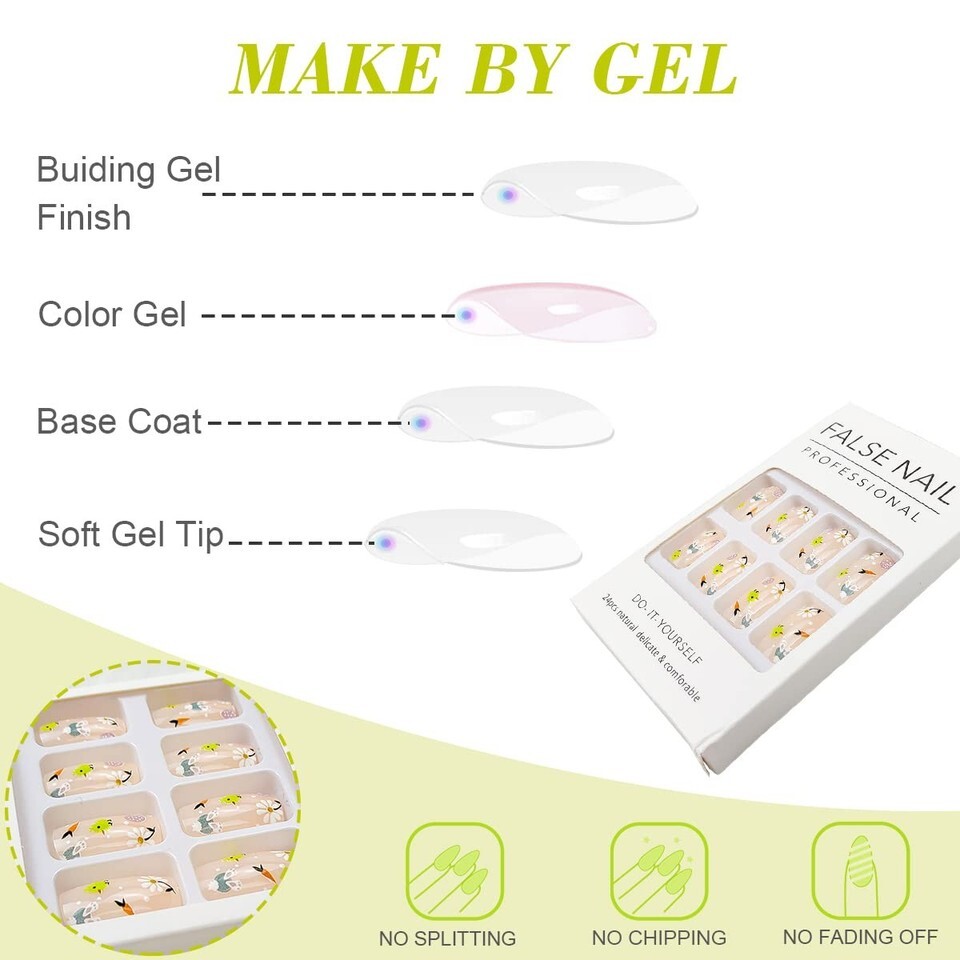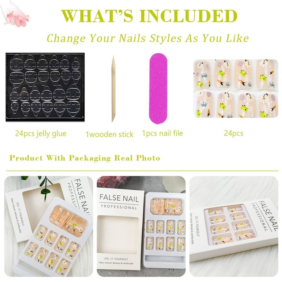 What Will You Receive: The manicure kit includes 24Pcs Easter bloom fake nails, 1 jelly glue, 1 mini nail file, and 1 wooden stick. Meet your needs for the home salon.