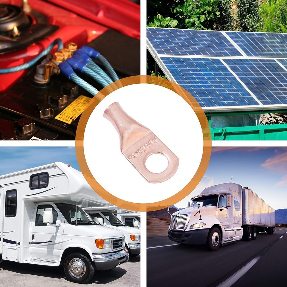 Elevate your electrical connections with our 25 pcs Waterproof 8 AWG Copper Ring Battery Lugs, designed for maximum conductivity and durability. These lugs are crafted from high-quality annealed tinned copper, providing a strong and reliable connection across various applications, from automotive to solar systems. With a blend of enhanced mechanical strength, heat tolerance, and safety certifications, you can trust that these battery lugs will stand the of time and meet all your connectivity needs.
