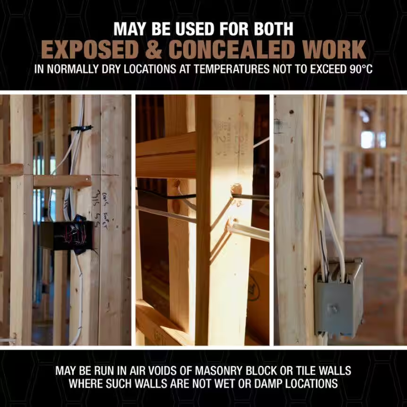 Southwire Romex Brand SIMpull NM-B (nonmetallic-sheathed) cable may be used for both exposed and concealed work in normally dry locations at temperatures not to exceed 90C (with ampacity limited to that for 60C conductors) as specified in the National Electrical Code. NM-B cable is primarily used in residential wiring as branch circuits for outlets, switches, and other loads. NM-B cable may be run in air voids of masonry block or tile walls where such walls are not wet or damp locations. Voltage rating for NM-B cable is 600 volts.