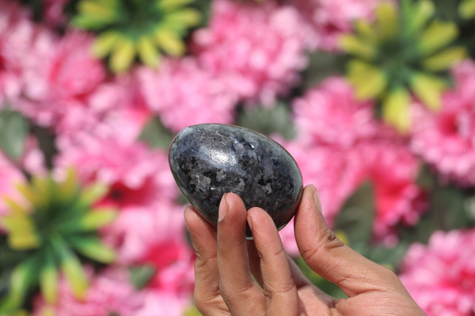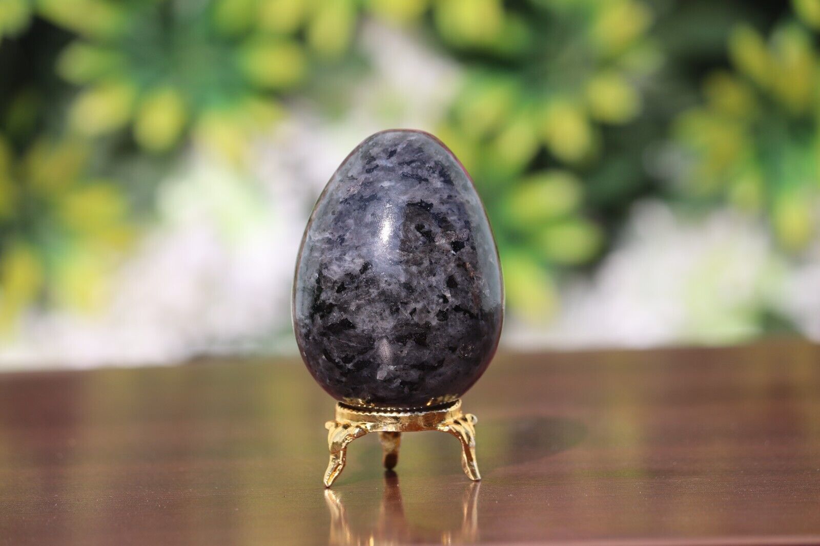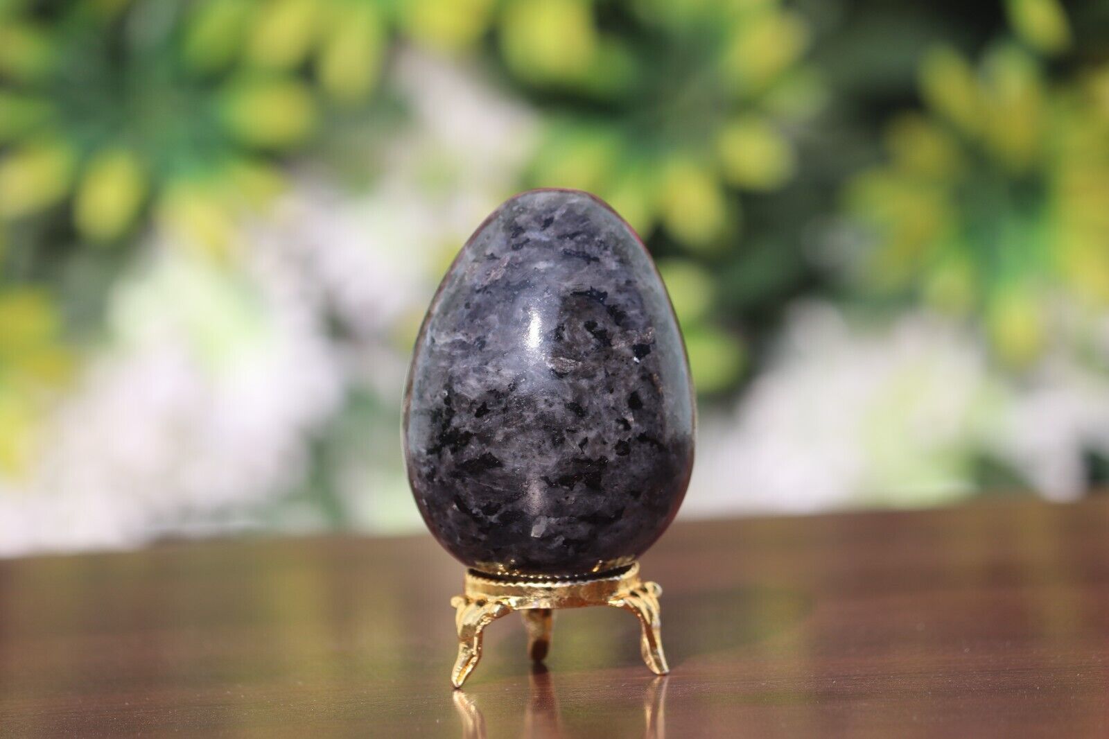 Natural Larvikite Egg Polished Sparkling Symbiotic Black Moonstone w/ Labradorite Gemstone Crystal Mineral Specimen - India + Stand