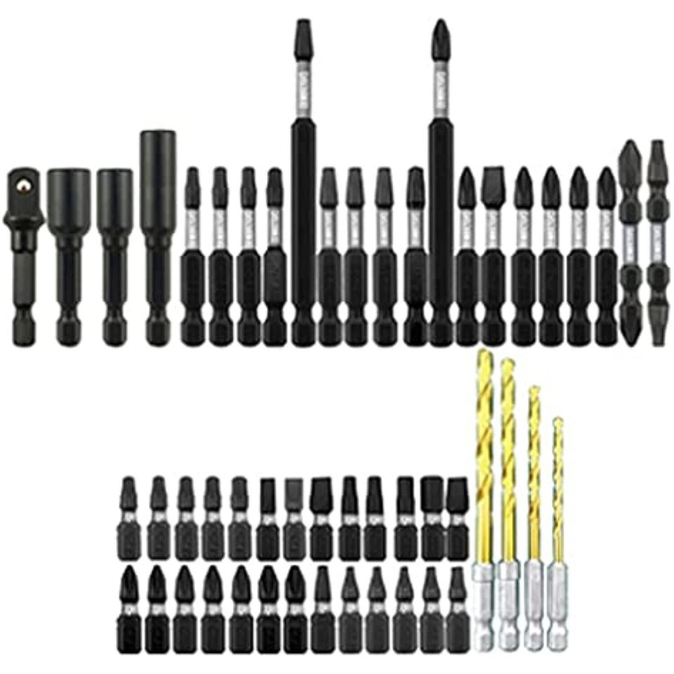 Highlights:50 PieceSize: AssortedImpact bits in plastic caseSet consist of 1 each: Compact magnetic bit holder, 1/4" Nut Driver, 5/16 Nut Driver, 3/8" Socket Adapter, PH1 Insert Bit, Pr2 Insert Bit, SQ1 Insert Bit, T30 Insert Bit, Slotted #6 Insert Bit, Slotted #8 Insert Bit, Slotted #10 Insert Bit, 1/8" Hex Insert Bit, 5/32" Hex Insert Bit, 3/16" Hex Insert Bit, 1/4" Hex Insert Bit, SQ3 Insert Bit, T15 Insert Bit, PH3 Power Bit, SQ3 Power Bit, T15 Power Bit, T30 Power Bit, Slotted #10 Power Bit, Titanium Red Helix Bits Sizes: 1/8", 5/32", 3/16" 1/4", ( 2) Double Ended Power Bits, (3) PH2 Insert Bits, (2) PH3 Insert Bits, (3) SQ2 Insert Bits, (2) T20 Insert Bits, (2) T25 Insert Bits, (3) PH2 Power Bits, (3) SQ2 Power Bits, (2) T20 Power Bits (2) T25 Power Bits