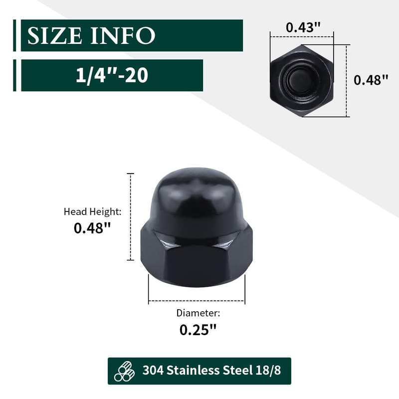 - 25PCS 1/4"-20 Hex Acorn Cap Nuts, 304 Stainless Steel, Black Oxide Finish