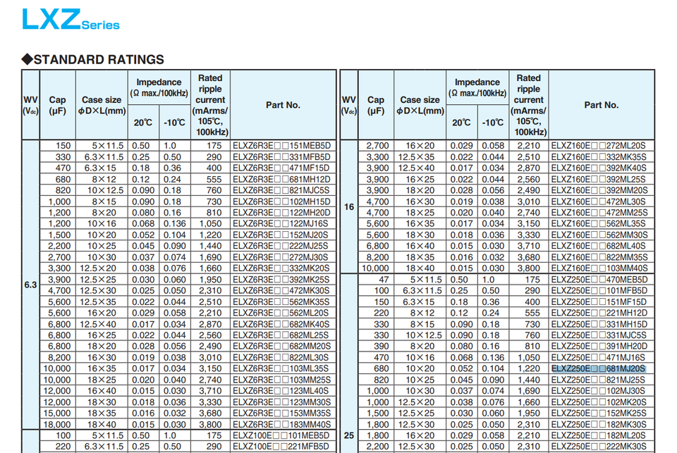 ELXZ250EC3681MJ20S, ELXZ250ELL681MJ20S, 680uF 25V LXZ |