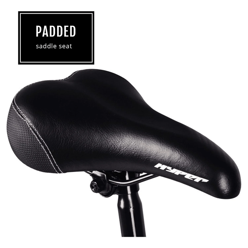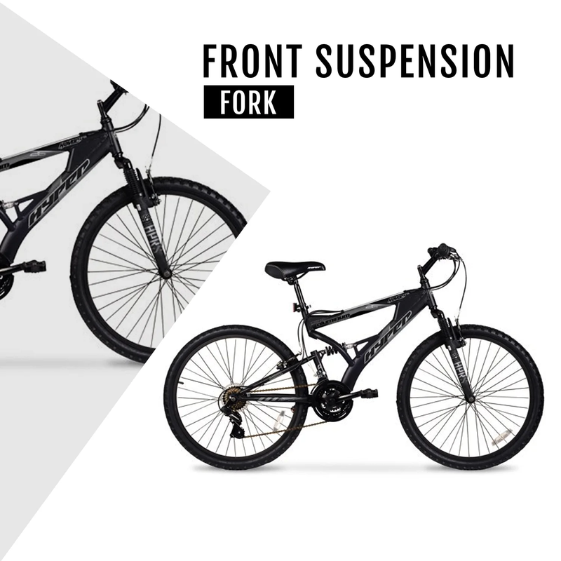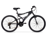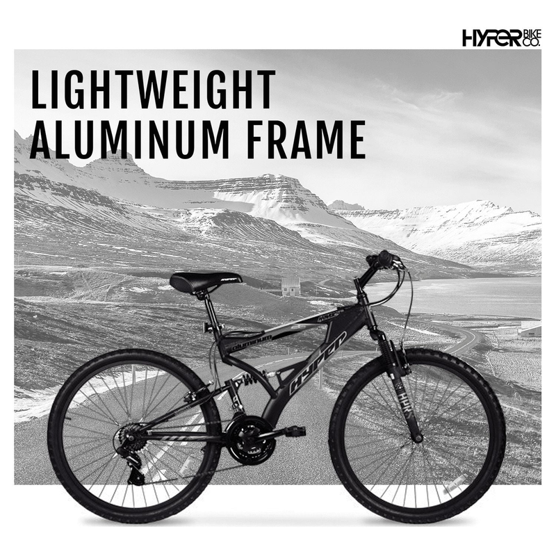 This Hyper Havoc Mountain Bike is the key to outdoor fun. It has a lightweight aluminum frame that lets users ride harder for longer, providing a reliable experience. The 26" Hyper Havoc is designed with a front and rear suspension to offer a smooth ride on any surface. It features 21 speeds, ensuring versatility in the ride. This mountain bike has a comfortable twist shifter and a rear derailleur, allowing riders to change the gears quickly and smoothly. It also features a three-piece, high-performance crank. This bike is made with standard pedals for a comfortable and secure ride. It has grips on the handlebars for sustained comfort and control. Additionally, the bike comes equipped with a plush MTB seat, so the backsides will stay comfortable on long rides. It has a sleek, black design that provides a modern look. The bike can be ridden on a variety of surfaces, allowing for flexibility in where you go with it.