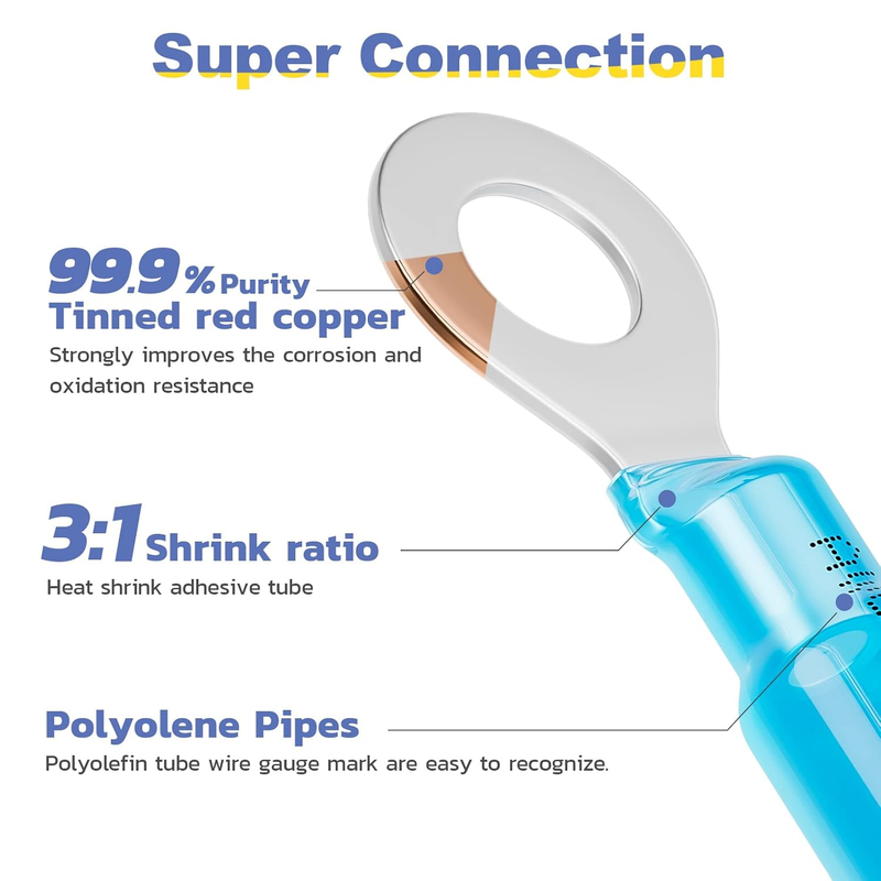 Constructed with thick, tin-plated red copper for superior conductivity and durability. Prevents rust, oxidation, and poor contact while resisting electrical sparks. Brazed seam design ensures wires won?t be damaged during crimping.