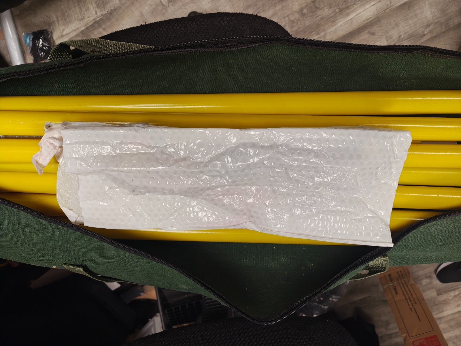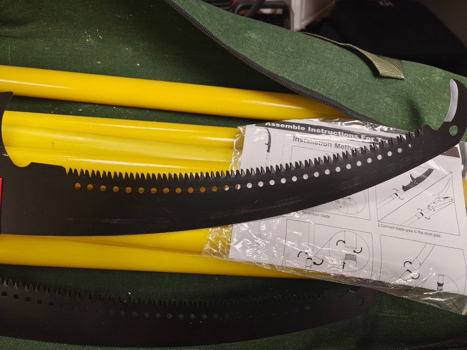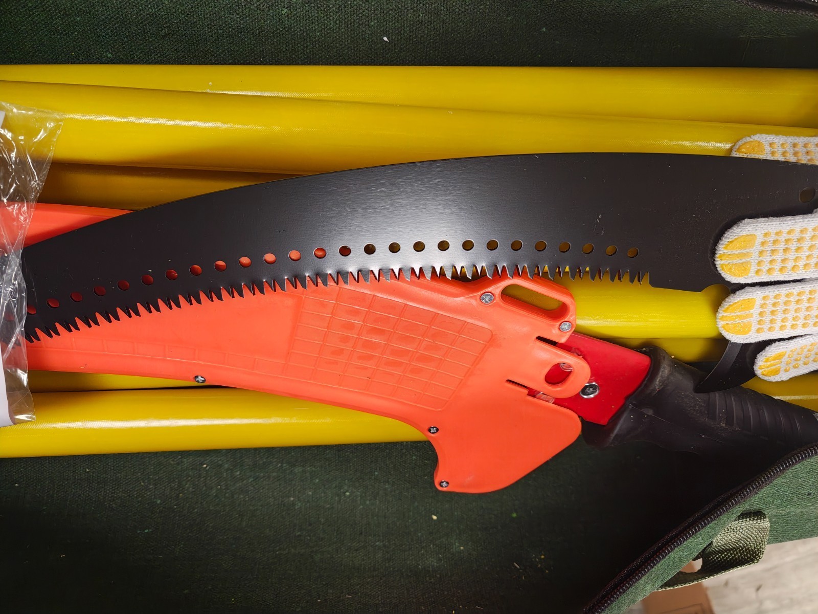 All-in-One Pruning Kit: Includes 2 saw blades (1 spare), saw sleeve, 8 fiberglass poles, pruning scissors, gloves, and canvas storage bag.
