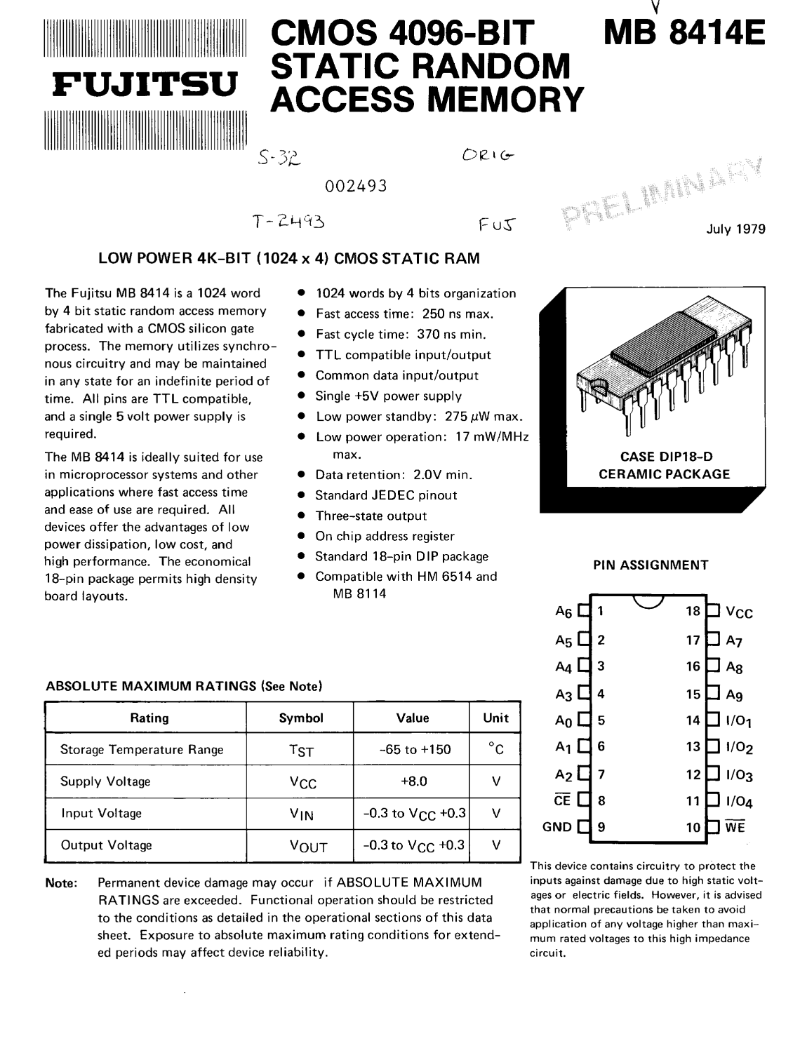 - 2PCS MB8414E Fujitsu Low Power 4K Static RAM 1Kx4 SRAM Ceramic CDIP-18