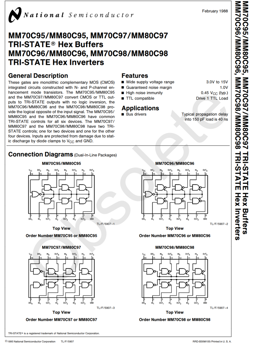 - 2PCS MM80C98N National Semiconductor Tri State Hex Inverters 3V to 15V DIP-16