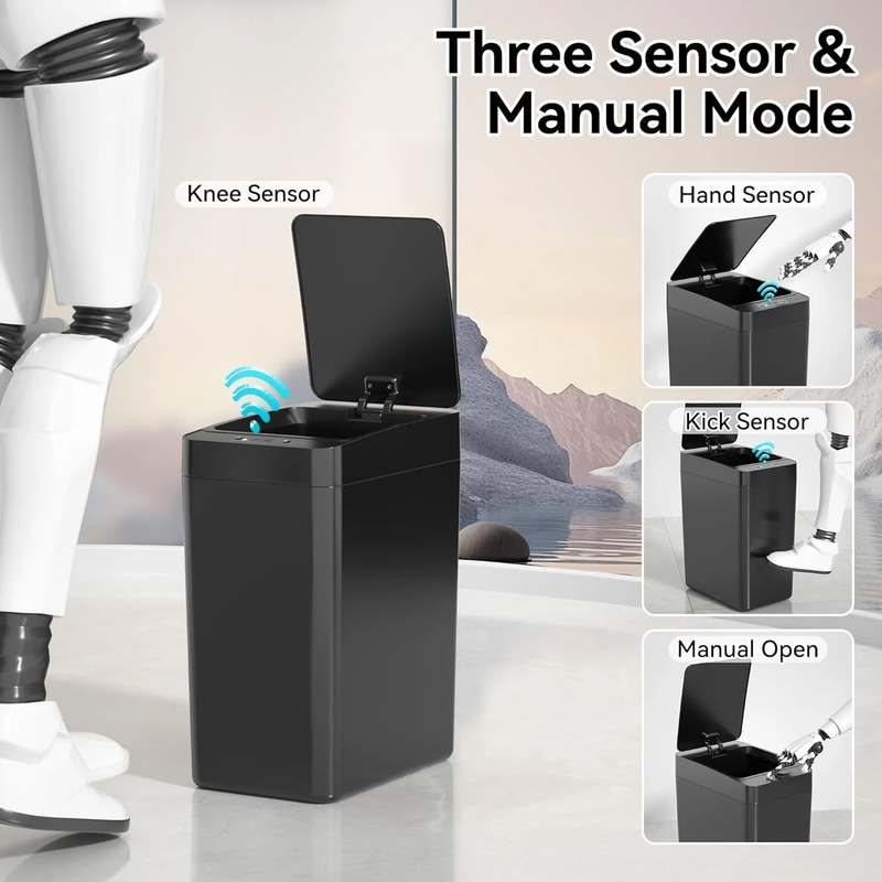 This touchless bathroom trash can utilizes advanced infrared sensing technology, 0.1 seconds of sensing automatically open the lid, and automatically close the lid if no object movement is detected within 5 seconds. If you need to keep the trash can open for an extended period, you can manually press the up-arrow button. After use, simply press the down-arrow button to close the lid of the trash can. The smart trash can with lid and a one-piece barrel design, ensures a fully sealed enclosure that effectively isolates odors from garbage, maintaining a fresh and pleasant indoor environment.
