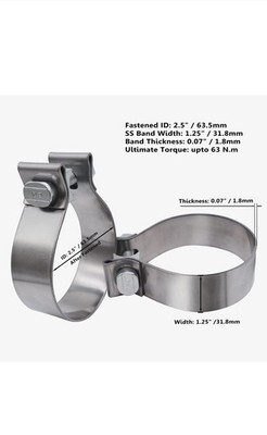 The product is a set of two 2.5" stainless steel exhaust clamps from Roadformer. These clamp-on clamps are designed to securely attach muffler exhaust pipes in place. The manufacturer offers a 1-year warranty for added peace of mind. Made of durable stainless steel, these clamps are a reliable and long-lasting solution for your exhaust system needs.