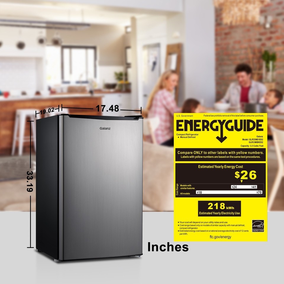 Enjoy the convenience of having your favorite chilled food, drinks, or snacks whenever you want with the Galanz 3.3 Cu ft One Door Mini Fridge in stainless steel look. The Galanz 3.3 cu ft One Door Mini Fridge is an ideal size for the dorm room, game room, exercise room, office, garage, bedroom, or any other living space. The Galanz 3.3 Cu ft One Door Mini Fridge features a full-width freezer compartment . The convenient reversible door allows you to choose to open from the left or right side making the Galanz 3.3 Cu ft One Door Mini Fridge suitable for any layout. Condition: New, Stock Number: GLR33MS1E02