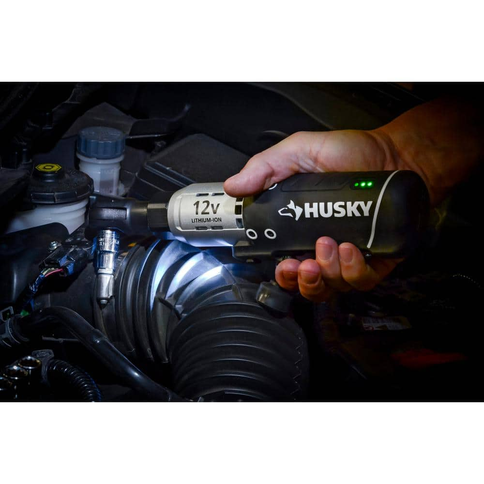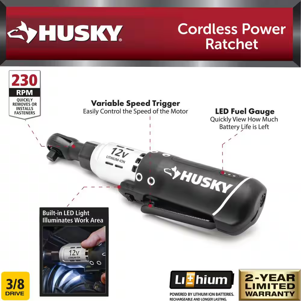 The Husky 3/8 in. drive cordless ratchet features a 12-Volt Lithium-Ion battery that produces 230 RPM. The low profile head and built-in LED lights provide users with the means to see and access tight working areas. Higher visibility and accessibility will make any job easier. The Ratchet can produce up to 30 ft./lbs. of powered torque, with variable speeds for precise control.
