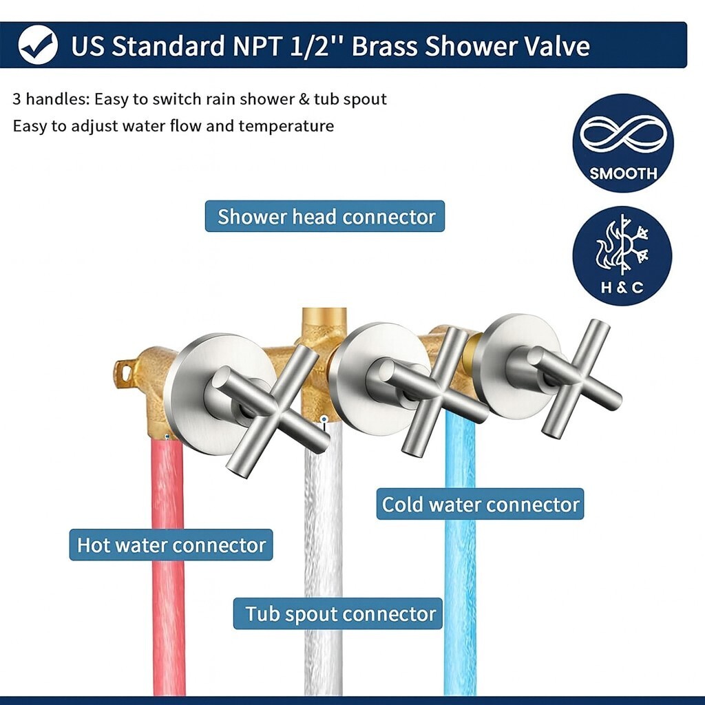 Premium quality materials: The main shower valve is made of selected high quality brass material to ensure non-corrosive, and brushed nickel surface give an elegant look to any bathroom decor.