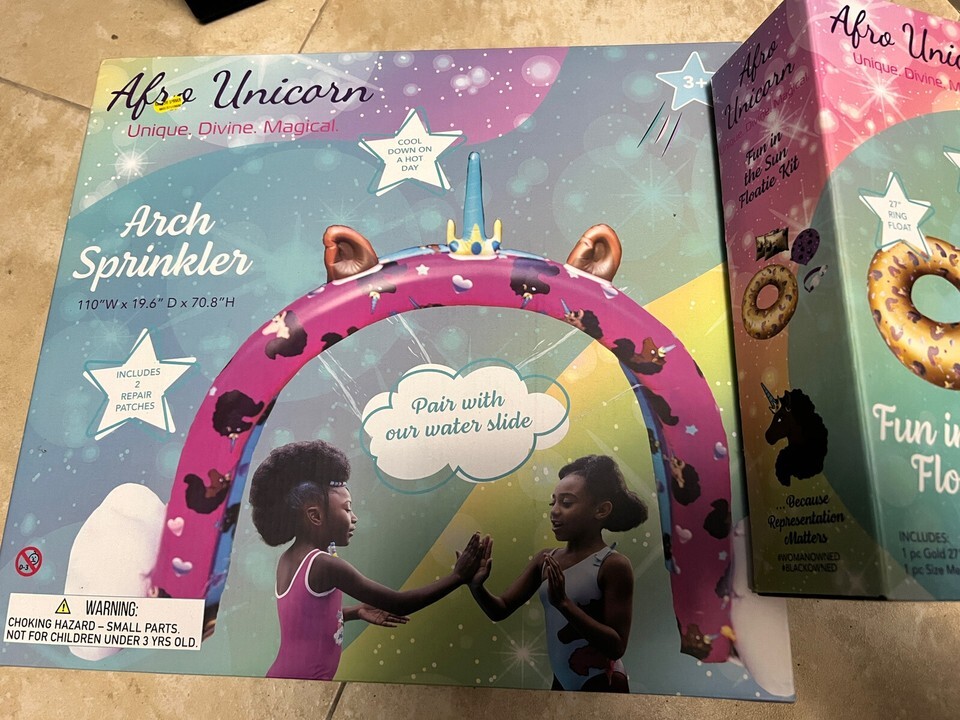 Selling one Afro Unicorn Split Ring inflatable pool toy, for kids. This item is new, and unopened.
