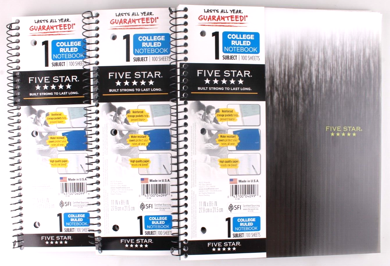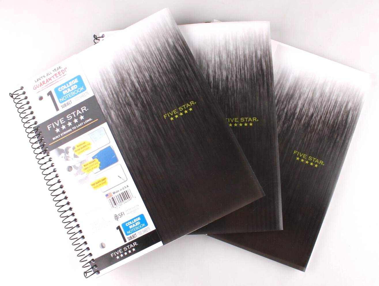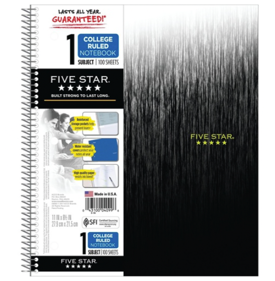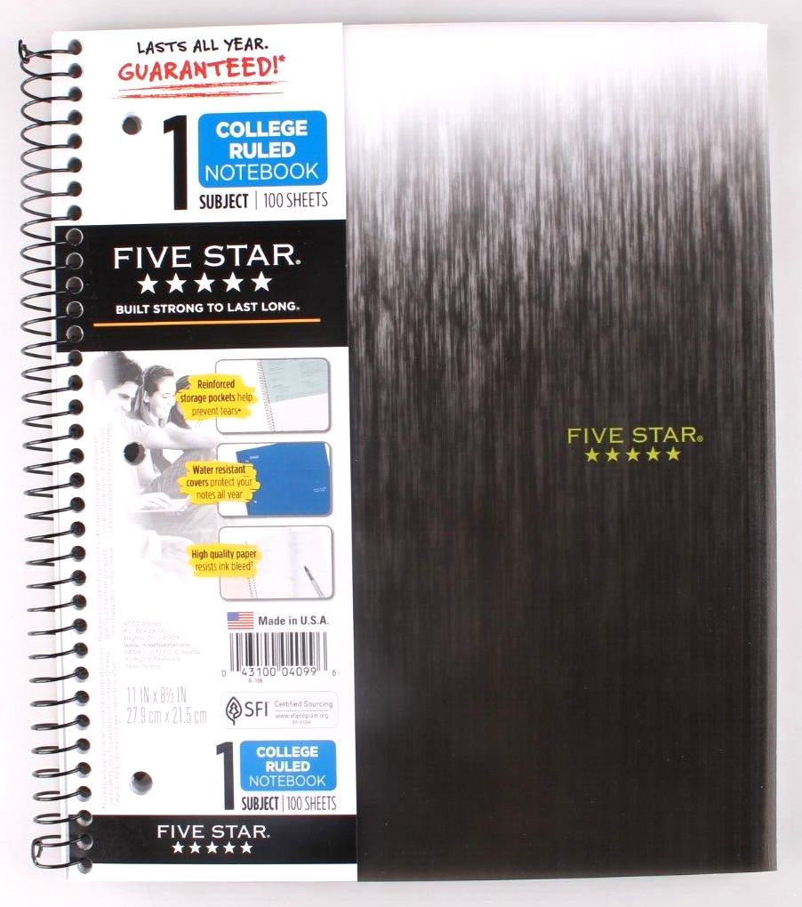 This is for a brand new 3 Pack of Five Star Black Spiral Notebook 1 Subject College Ruled 100 Sheets Wirebound notebook front cover is printed with a graphic design. Water-resistant plastic front and back covers protect notes. 1 subject notebook has 100 college ruled sheets. 11? x 8 1/2? perforated pages. Notebook is 3-hole punched. Includes 2-pocket page divider.