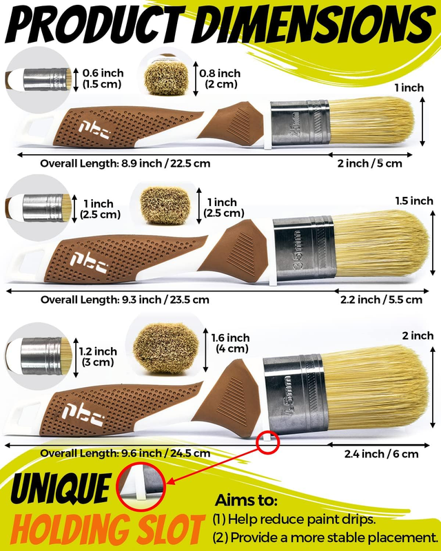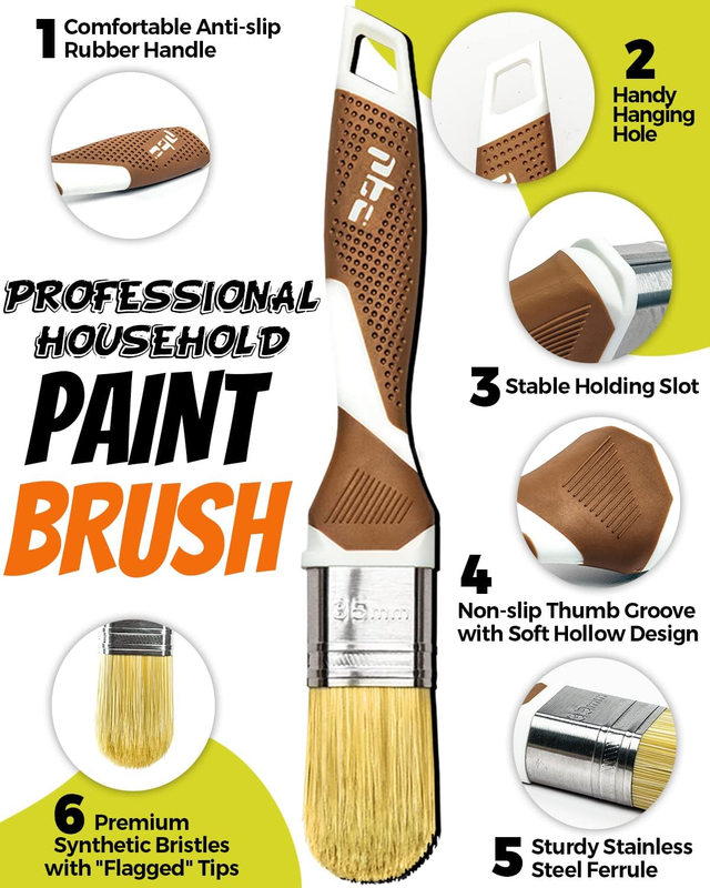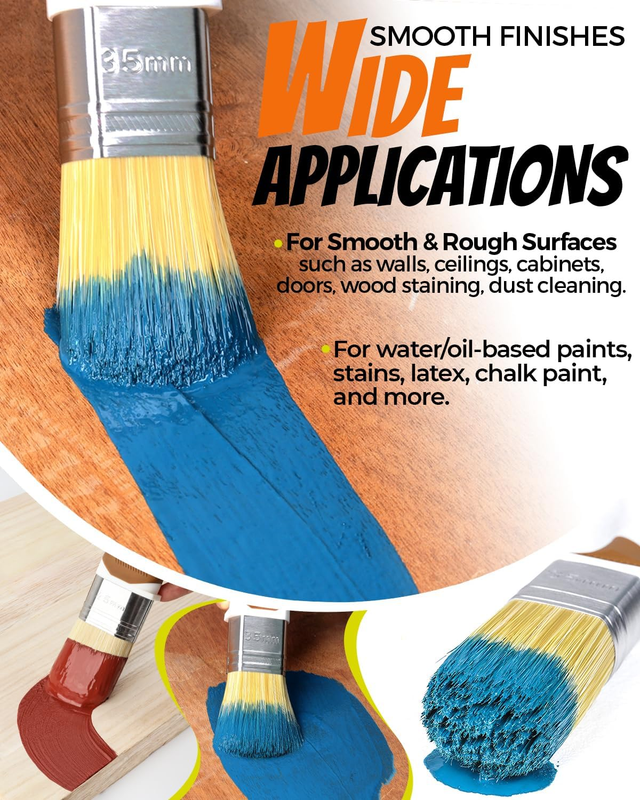 ?All-around Paint Brush Set?Perfect paint brushes for painting walls, ceilings, furniture, cabinets, doors, windows, wardrobes, touch-ups, varnishing, fence and deck staining, arts and crafts, dust cleaning, etc. Works with all water-based and oil-based paints, latex, stains, chalk paint and wax, etc.
