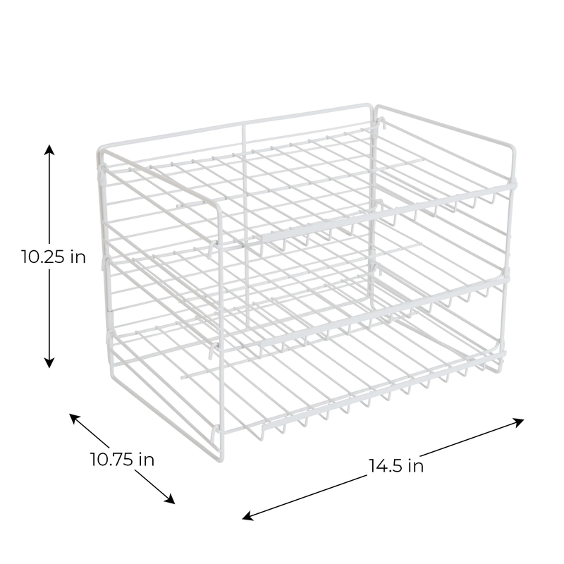 Keep all of your canned foods organized and maximize your cabinet space with the help of a Mainstays 3 Tier Can Organizer. This can rack features a simple yet functional design and pairs well with most any kitchen decor, making it a practical choice. A Mainstays can organizer can hold up to 27 standard size 15.25 oz cans. It has a stacked shelf design that makes use of the vertical space in cupboards, allowing users to store even more, making it a good space saving solution for pantries both large and small. The gravity flow design of the can storage organizer allows users to see each label clearly, eliminating the need to dig or shuffle through canned goods. This rack is designed to automatically roll the cans forward when one is removed and the shelves may be adjusted to fit larger size cans. The Mainstays 3 Tier Can Organizer can organizer features a sturdy steel construction for long lasting use and is a nice addition to kitchen pantries and countertops.